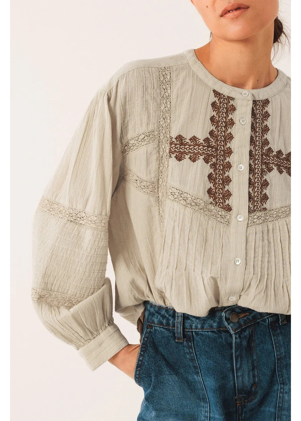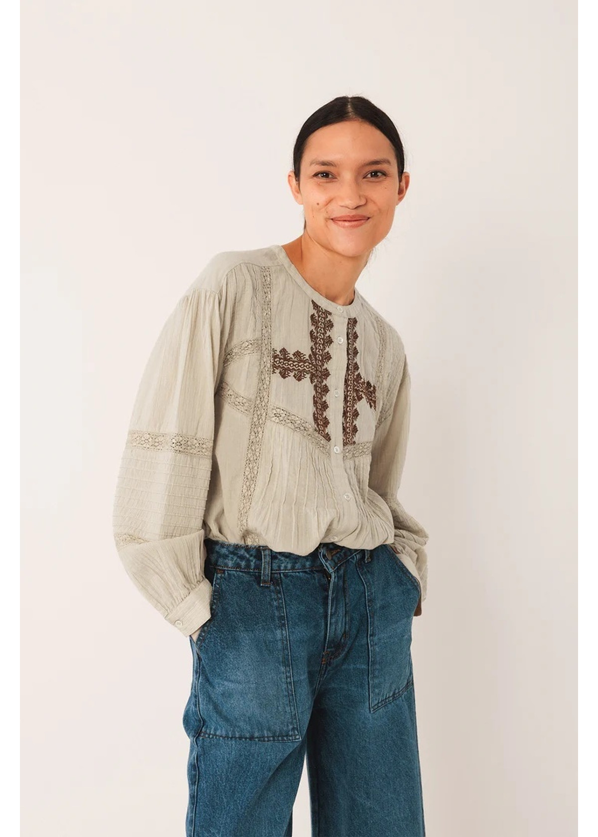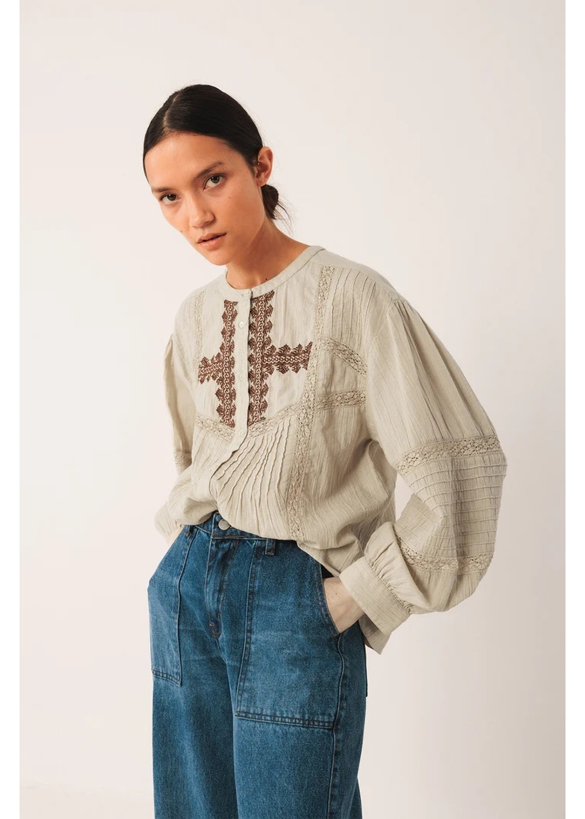 • Hombro ligeramente caído y manga globo con puño y cierre de botón • Cierre frontal abotonado • Bordados con motivo étnico, puntilla insertada y pliegues en talle y mangas • Tejido en gasa de algodón orgánico • Regular fit: Diseñado para llevar un fit estándar