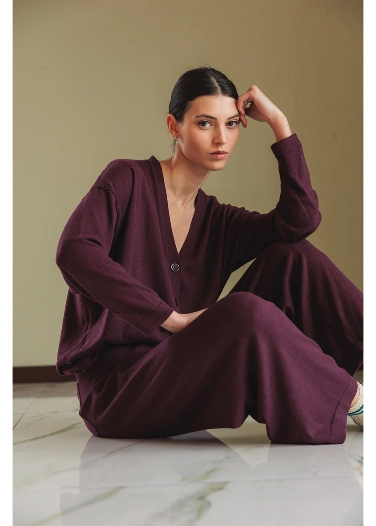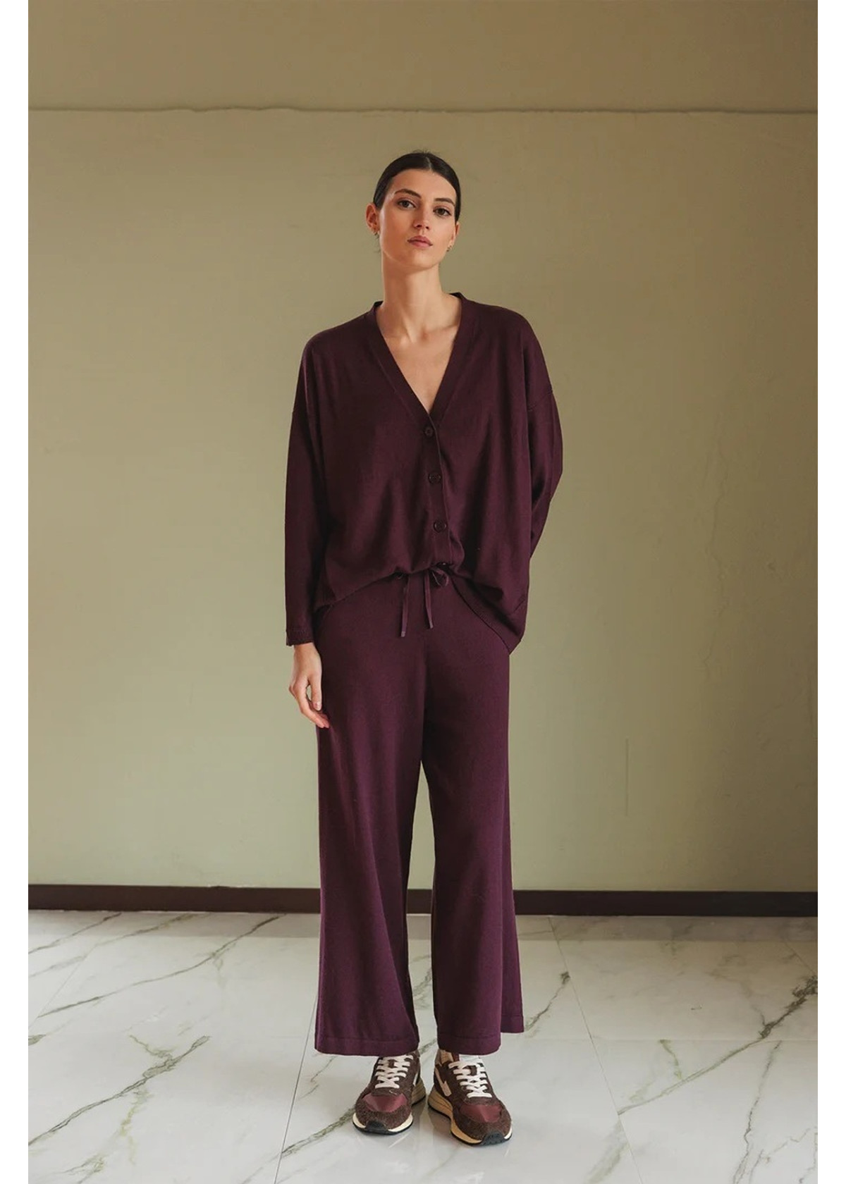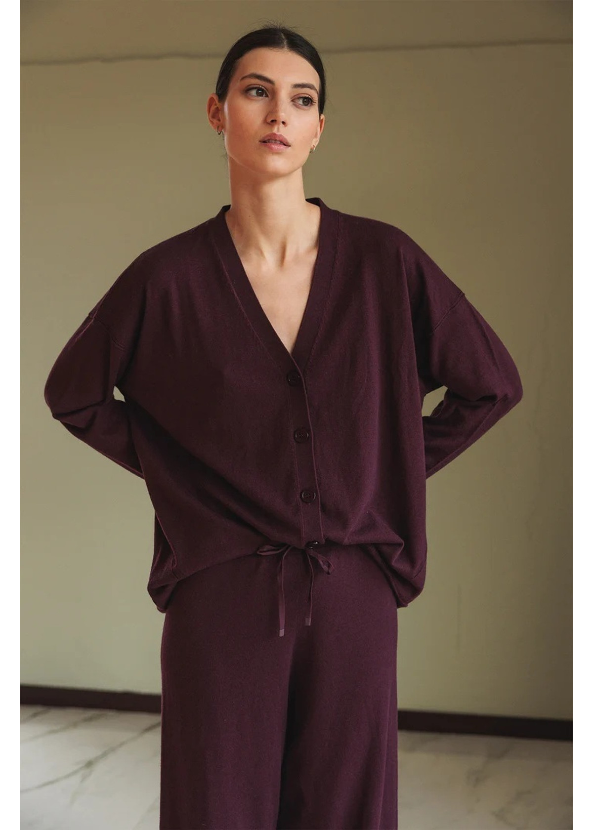 • Escote en forma de V • Hombro caído y cierre central abotonado • Detalle de menguados y desagujados • Tejido en punto de lana combinado con hilo de origen marino • Fit oversize: Diseñado con un fit más grande de lo habitual