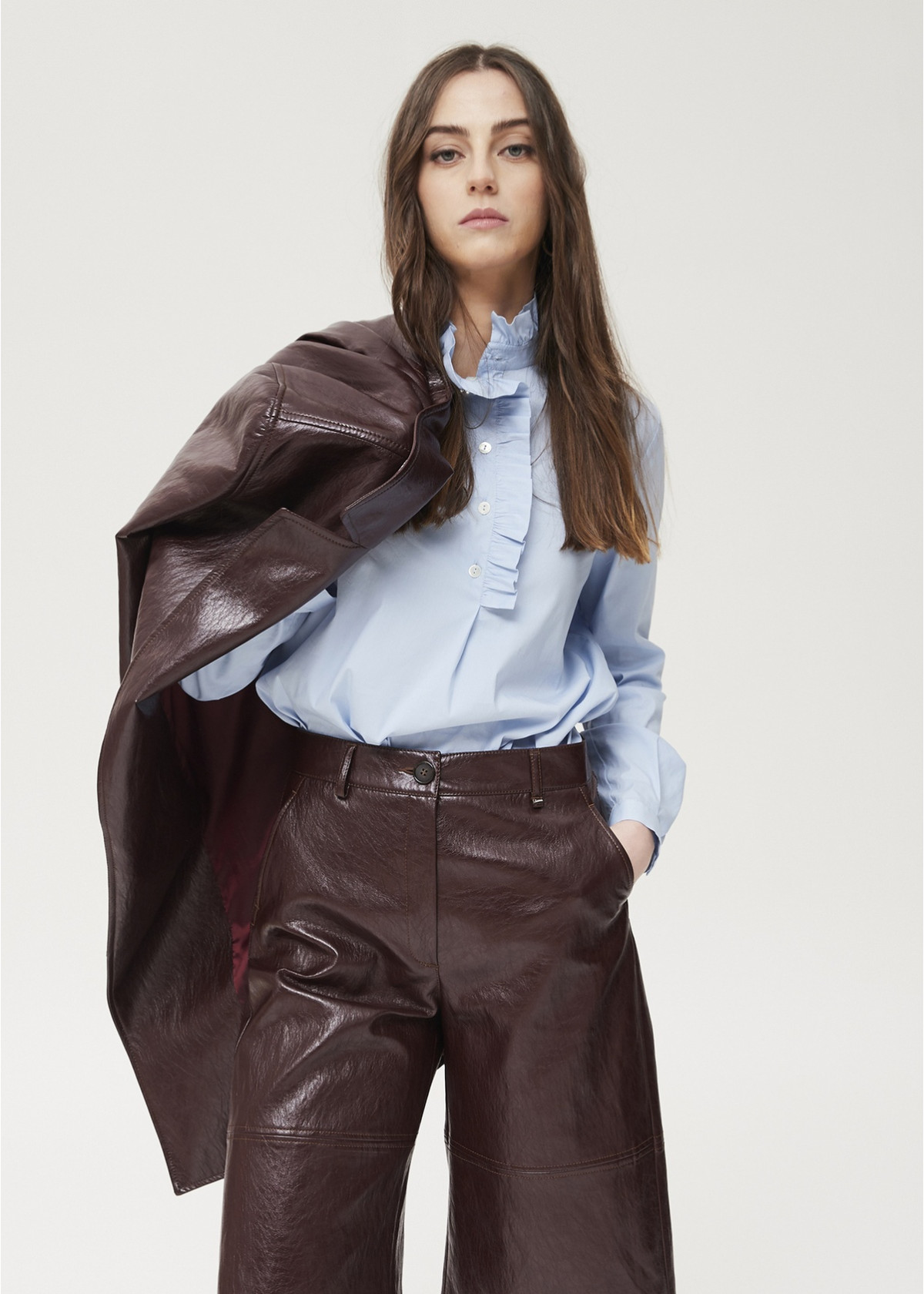 Camisa manga larga con cuello caja alto y adorno de volante en cuello y escote.