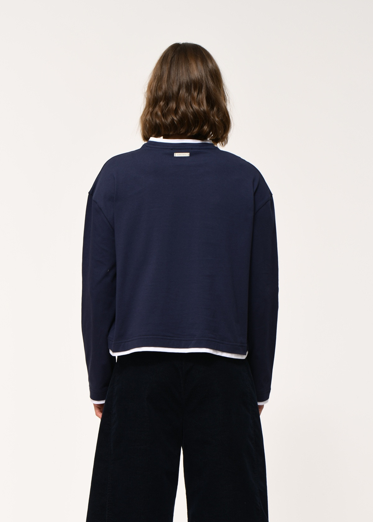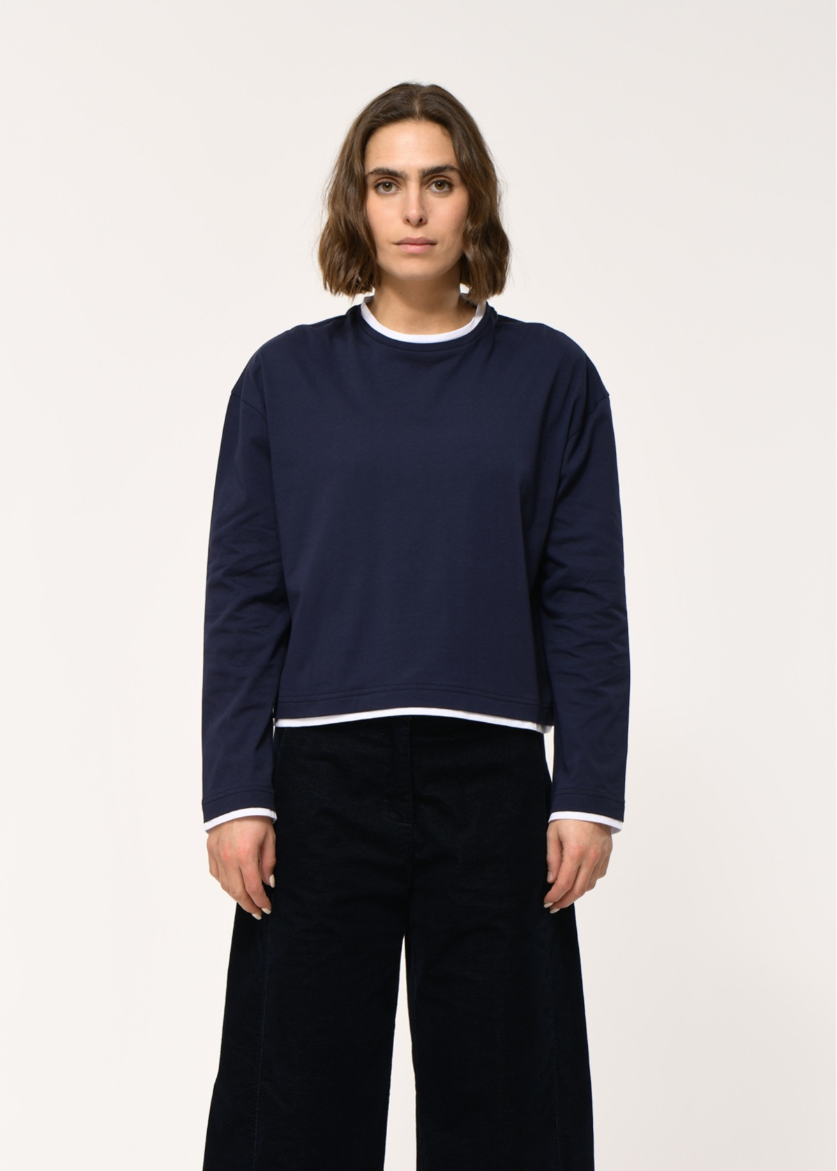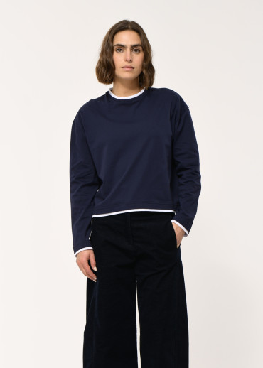 Camiseta de algodón orgánico de manga larga, cuello redondo, corte recto y doble ribete en contraste en el escote, bajo de las mangas y cuerpo.