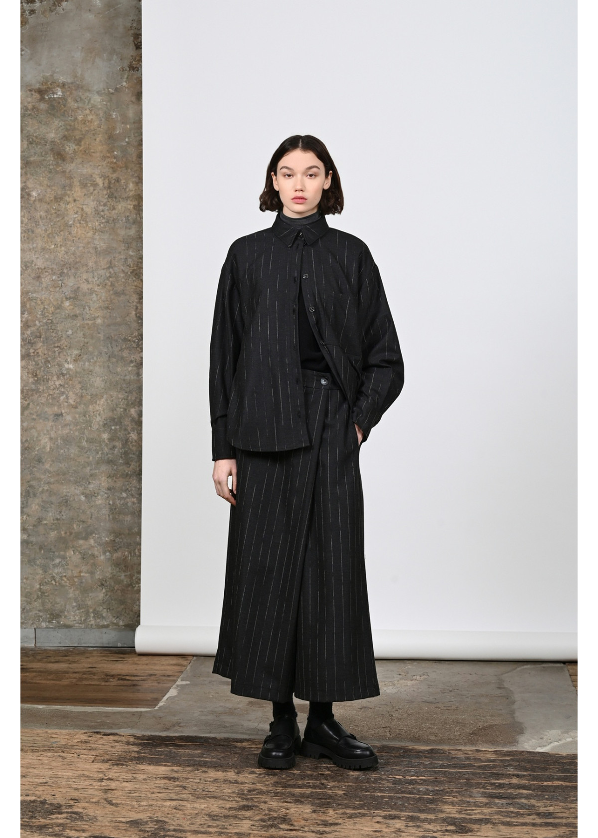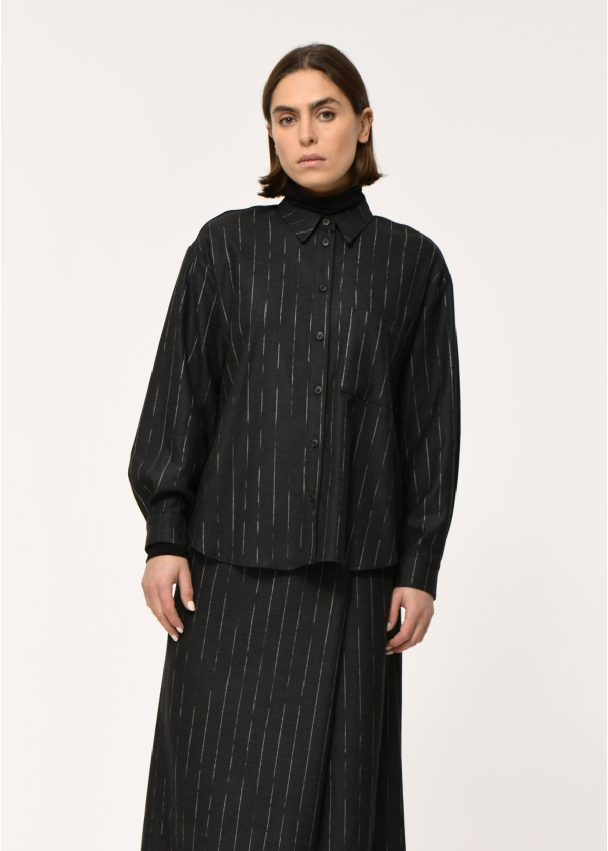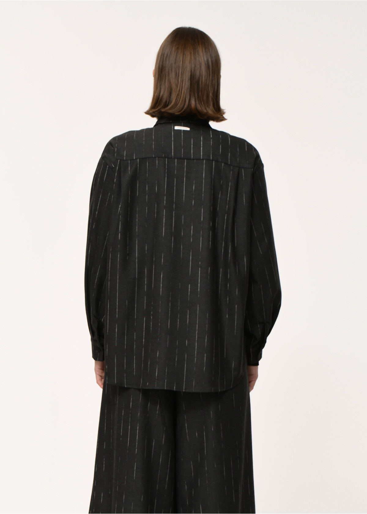 Camisa oversize con finas rayas irregulares, corte holgado, manga larga, sisas caídas, puños abotonados, bolsillo de parche en el pecho y borde ligeramente redondeado.