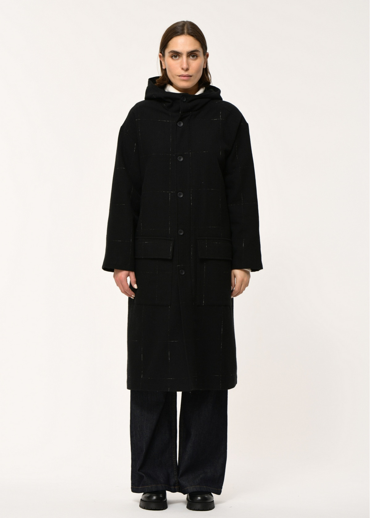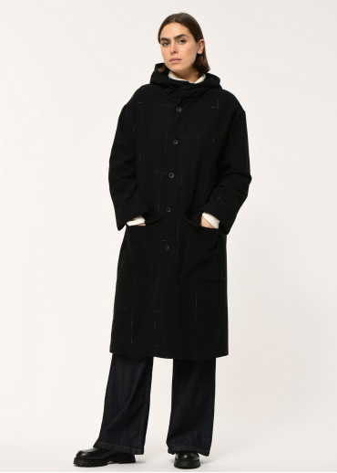 Abrigo largo con estampado de cuadros derretidos, corte oversize, cuello alto con capucha, cierre de cremallera y botones ocultos con tapeta, manga larga, sisas caídas, bolsillos de parche con solapa y forro completo.