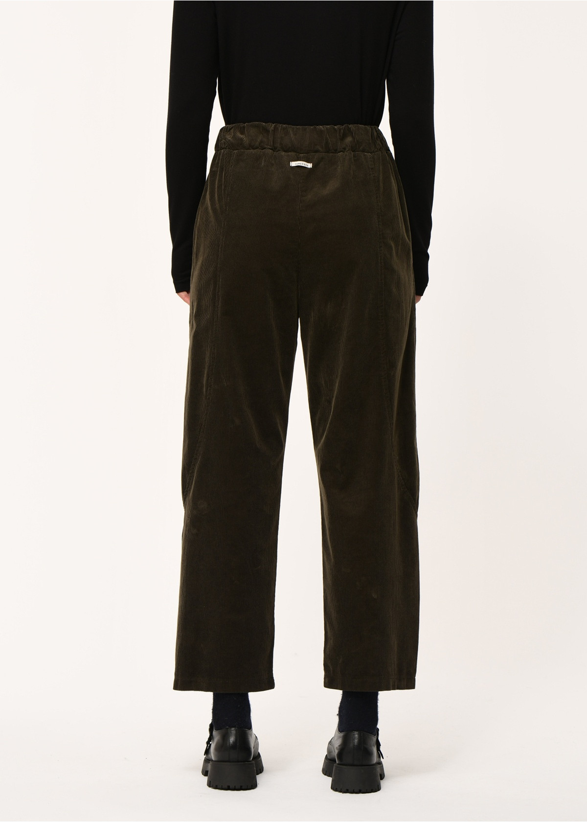 Pantalón de pana de 7/8, corte redondeado con aberturas, cintura alta elástica y bolsillos laterales inclinados.