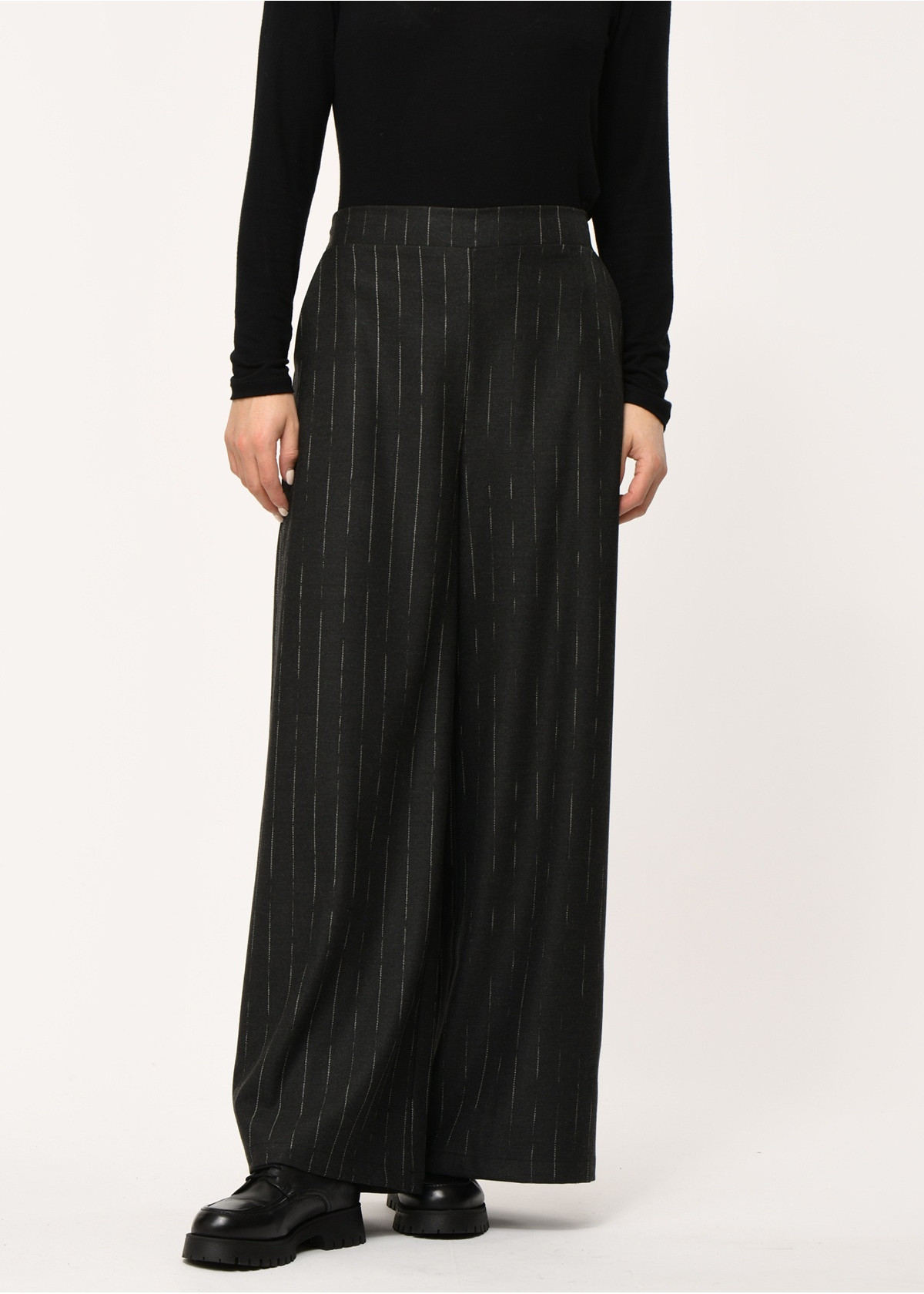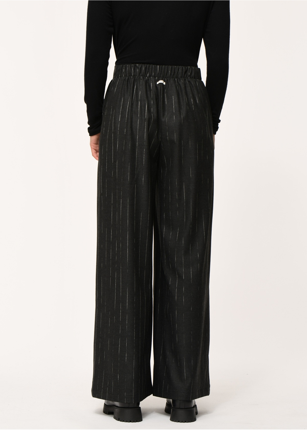 Pantalones con rayas finas irregulares, perneras anchas, cinturilla plana con elástico en la parte trasera y bolsillos inclinados.