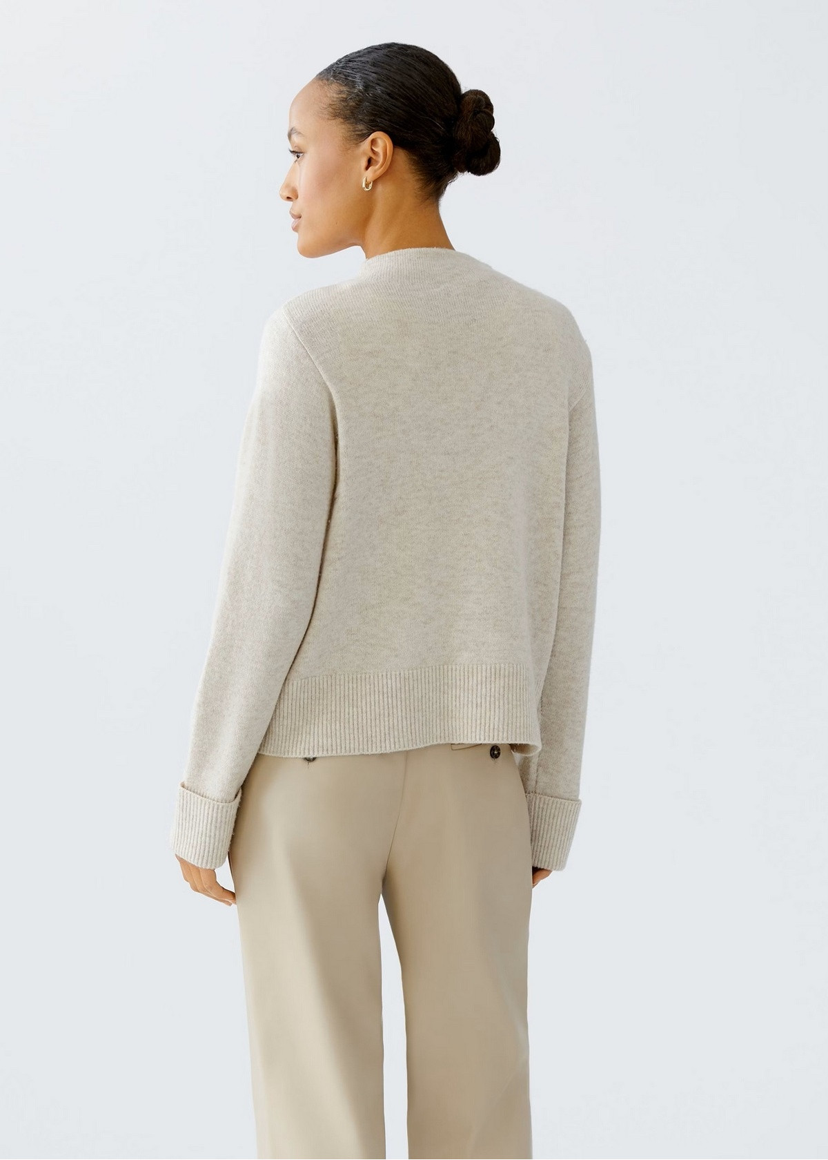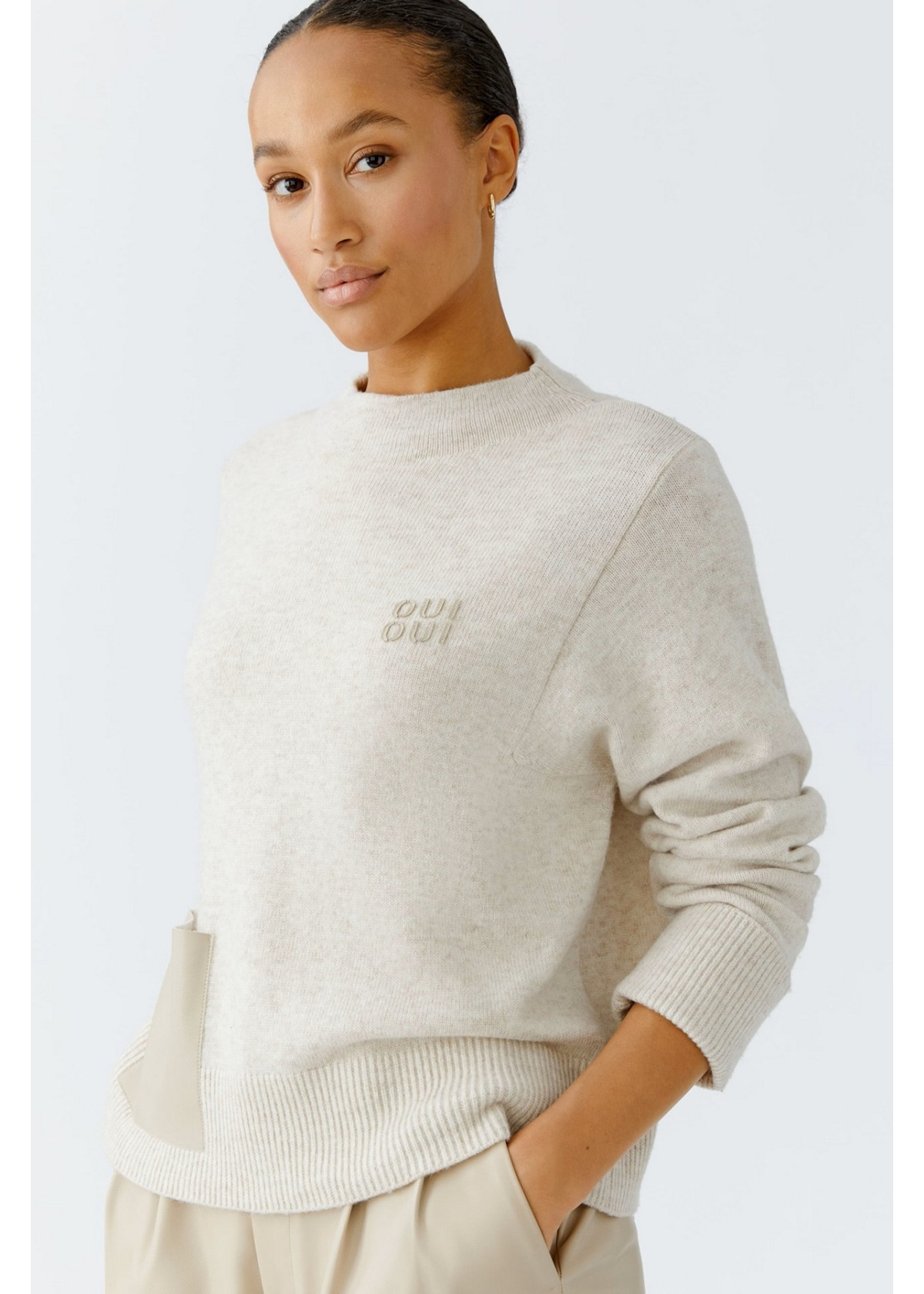 Dos mezclas de hilos se unen para evitar el contacto de la lana con la piel Corte informal, largo regular Cuello alto corto de canalé doble Mangas largas cuadradas con puños altos de canalé Bolsillo grande y logotipo de OUI cosido en imitación de cuero