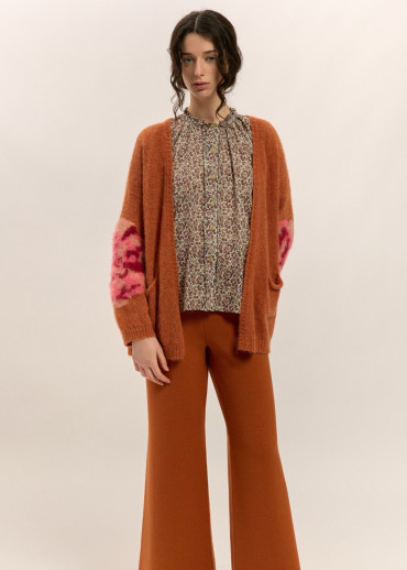 Chaqueta de punto de manga caída con detalle de intarsia de flores en mangas. Cuello pico y puños y bajos en canalé.