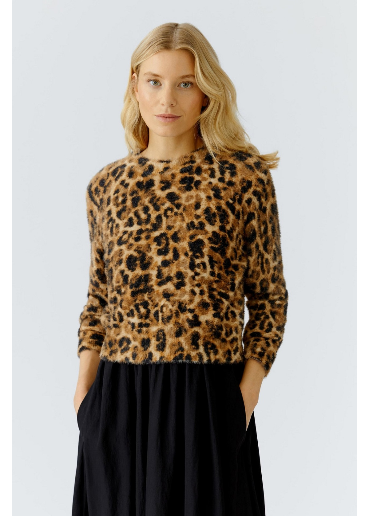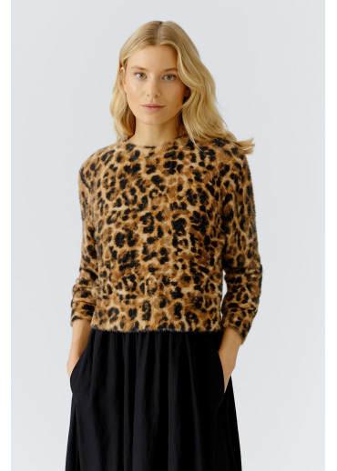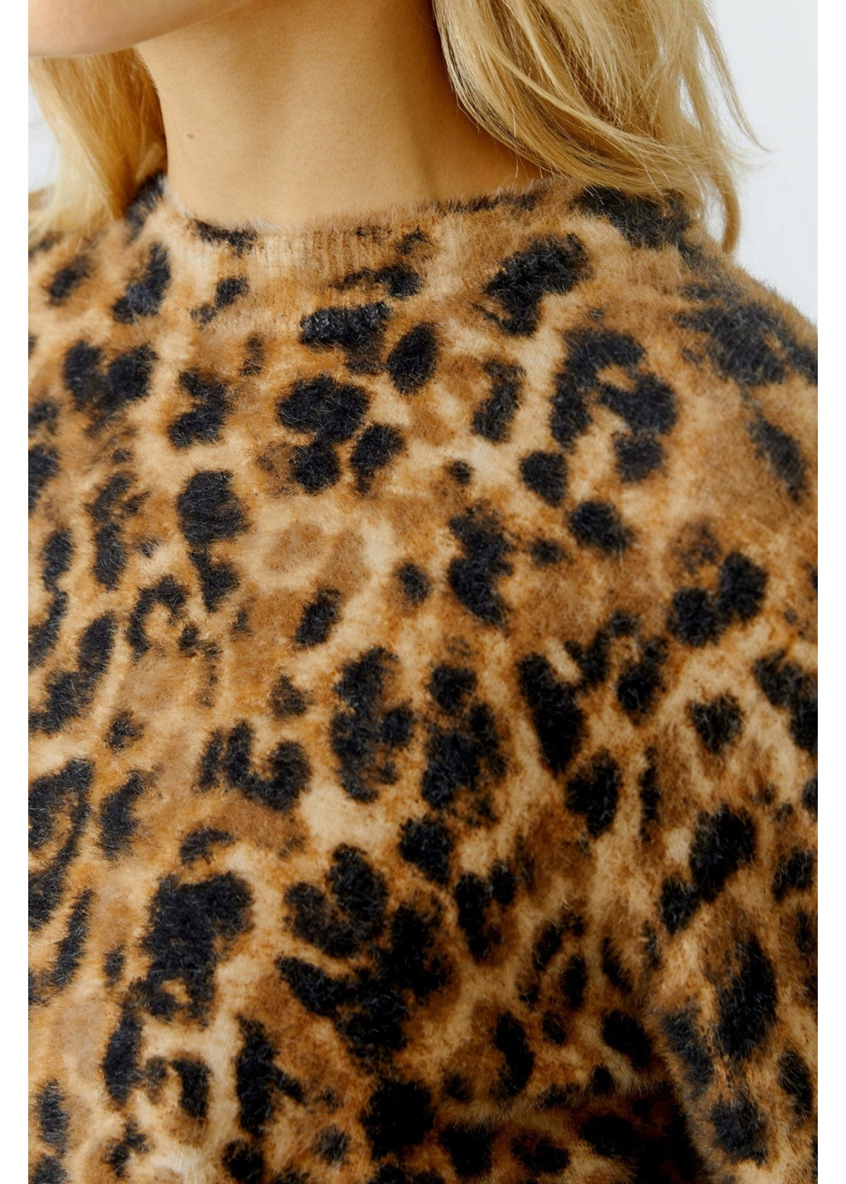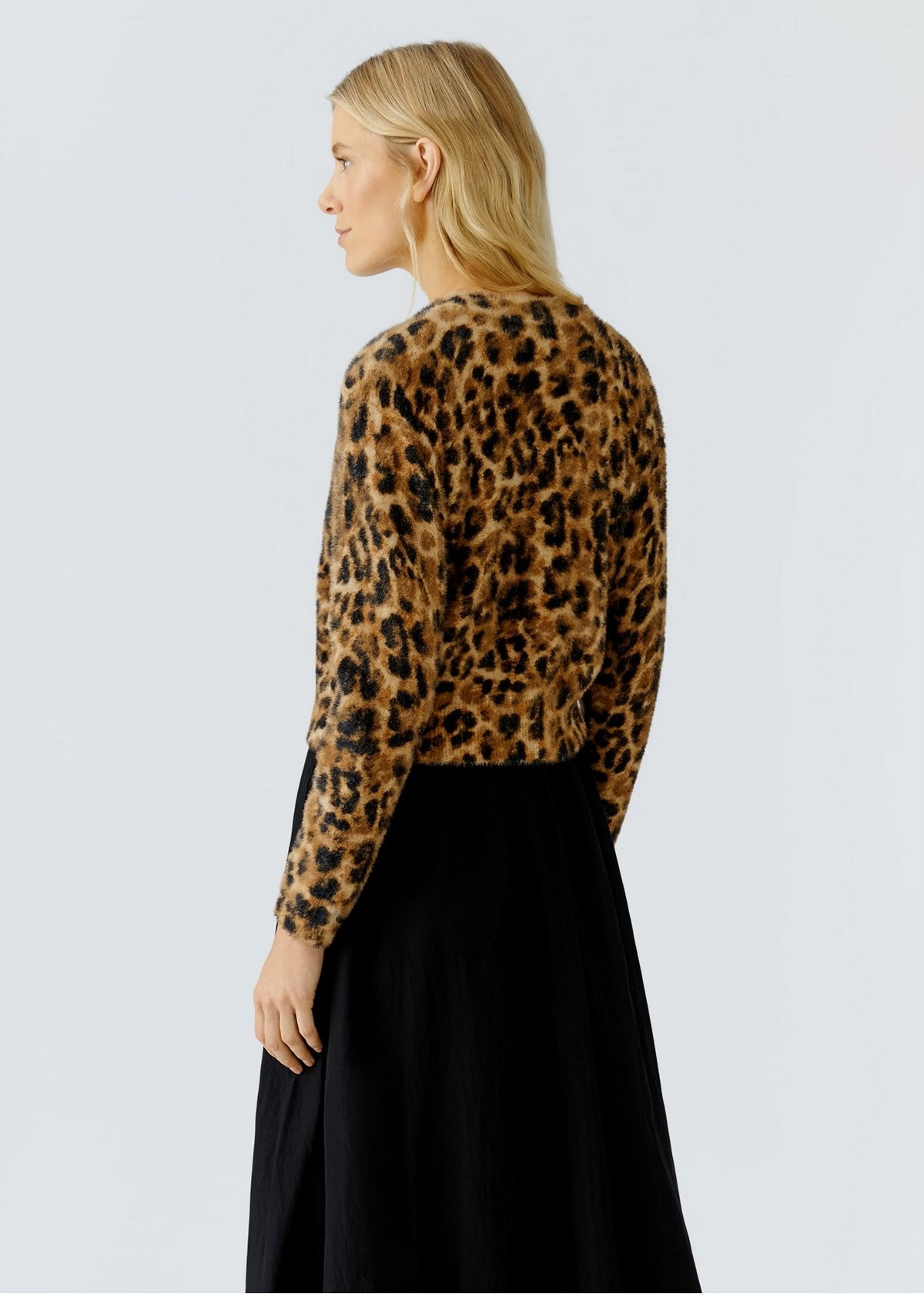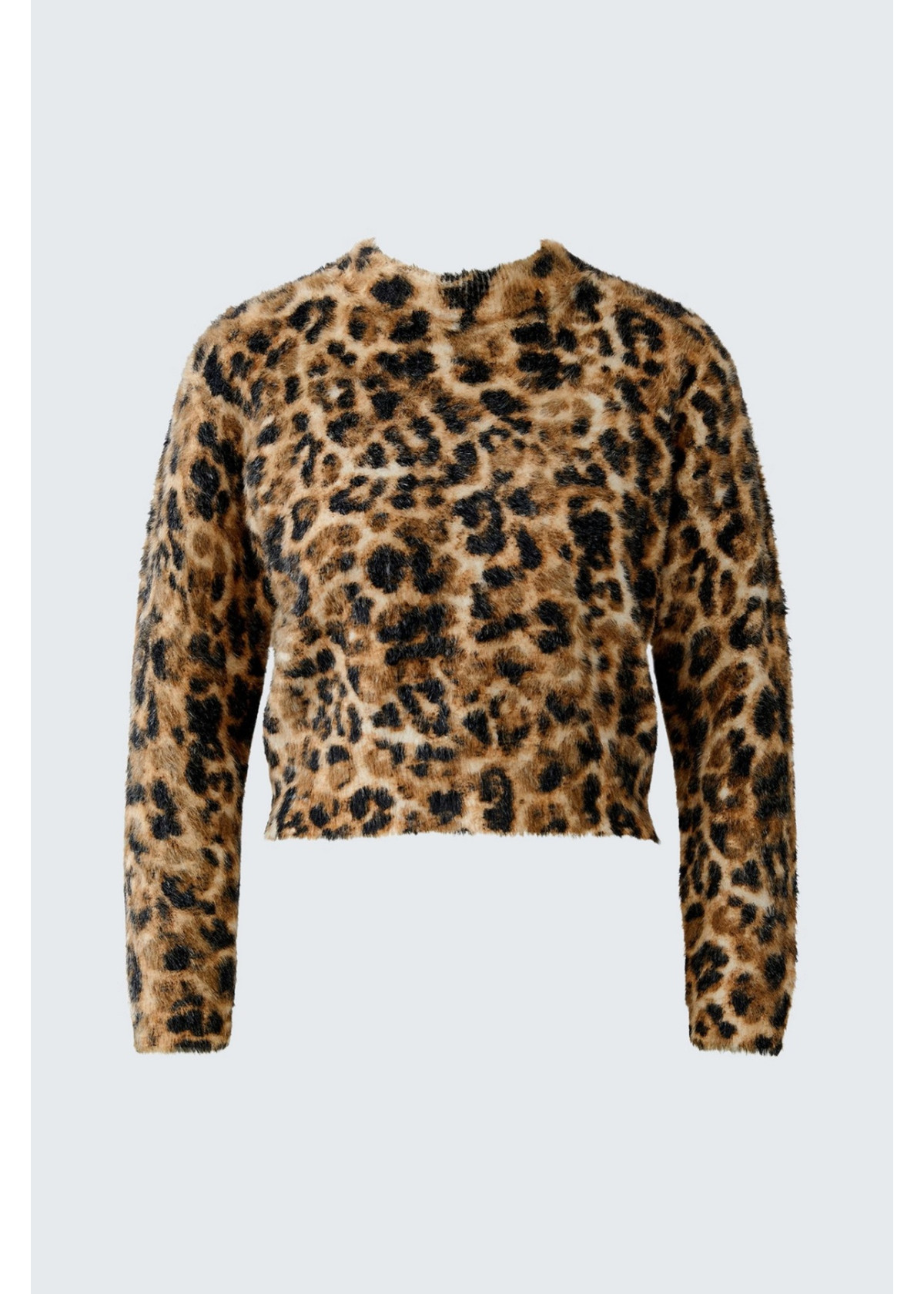 Exterior de hilo con efecto piel, interior de viscosa suave y de primera calidad, estampado integral de leopardo. Corte entallado, largo cropped. Cuello alto corto de punto doble en canalé fino. Mangas largas, estrechas y rectas. Puños de punto ajustados y estampados integrales,