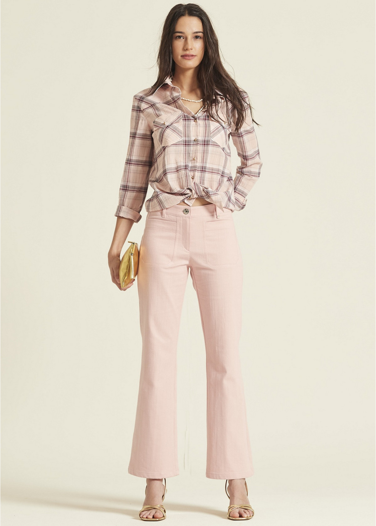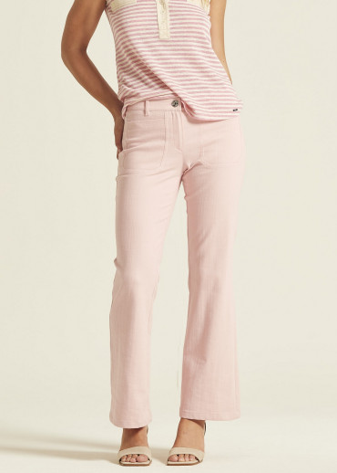 Pantalón confeccionado en sarga de algodón elástica que ofrece una silueta impecable y confortable. Diseño de talle medio y corte ligeramente acampanado en un suave tono rosa. Destaca por sus amplios bolsillos de plastrón frontales, cierre de cremallera con botón metálico y trabillas en la cintura