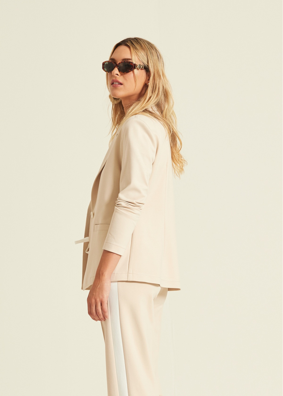 Chaqueta tipo blazer confeccionada en punto roma elástico de alta calidad, que ofrece una estructura elegante con la comodidad de una prenda de punto. Un diseño sin forro de acabado ligero que presenta cuello de solapa, cierre frontal de un solo botón a tono y bolsillos laterales de ojal.