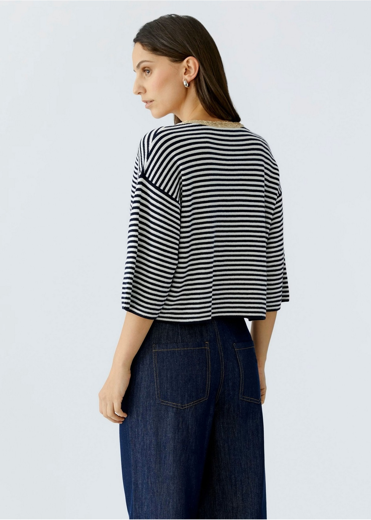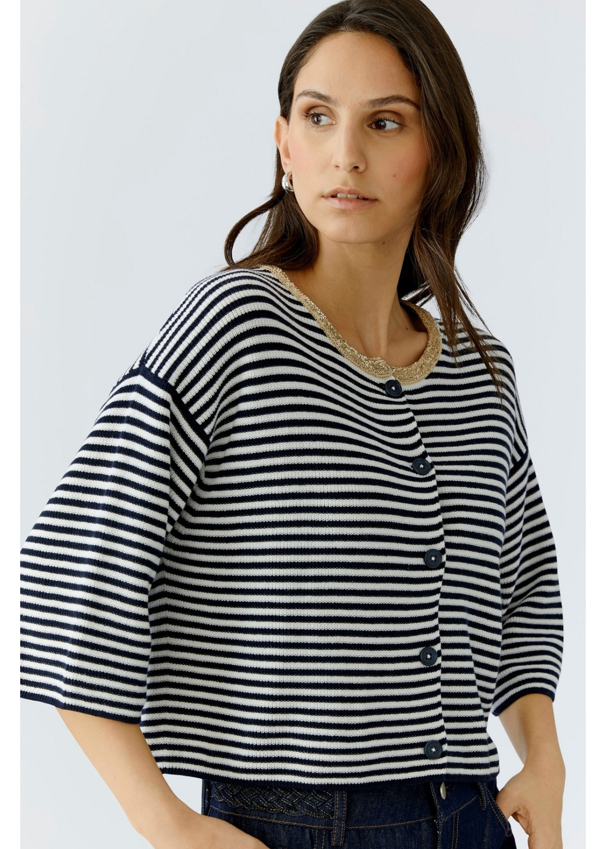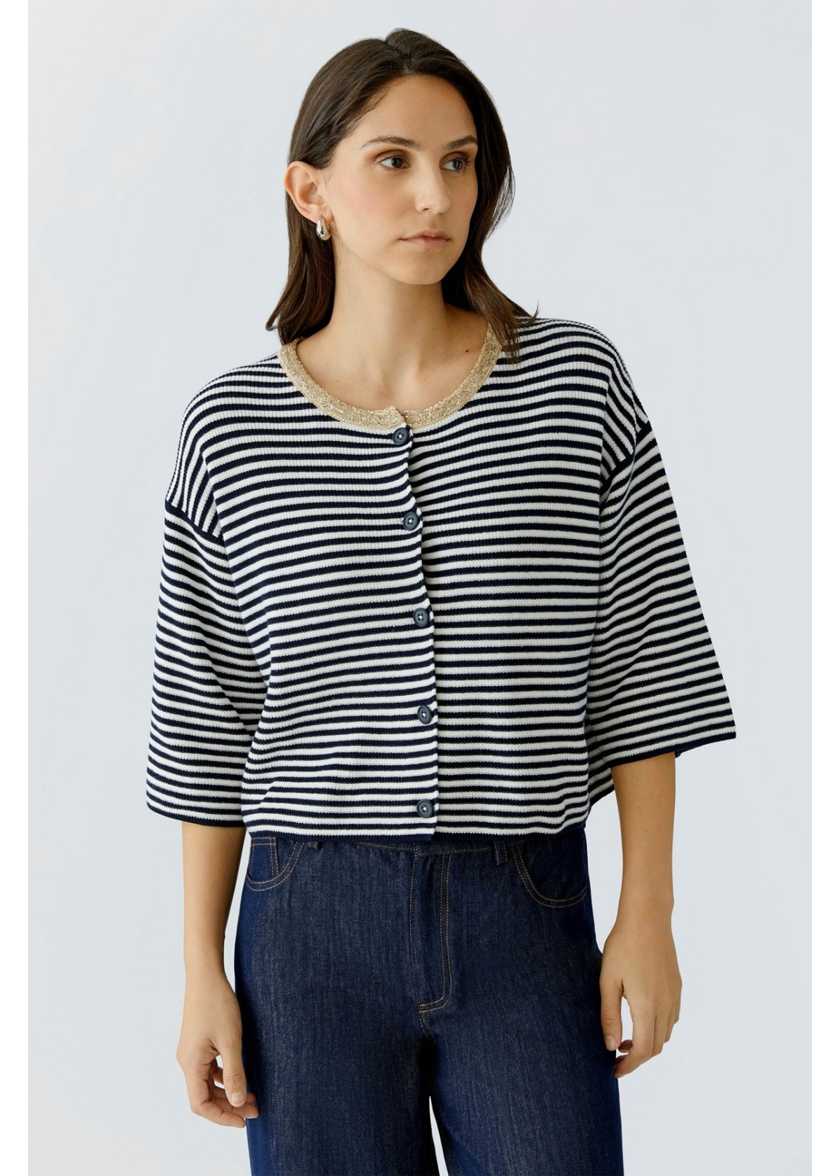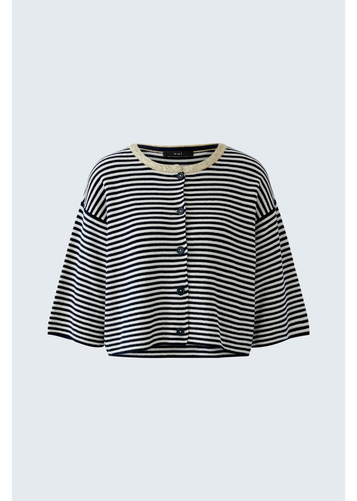 Cárdigan informal con ribete decorativo en el cuello redondo. Tejido de algodón puro con diseño de rayas y canalé fino. Corte oversize, largo corto con hilo exterior de color en contraste y minilentejuelas Hombros muy superpuestos, manga 3/4 suelta Bajo recto