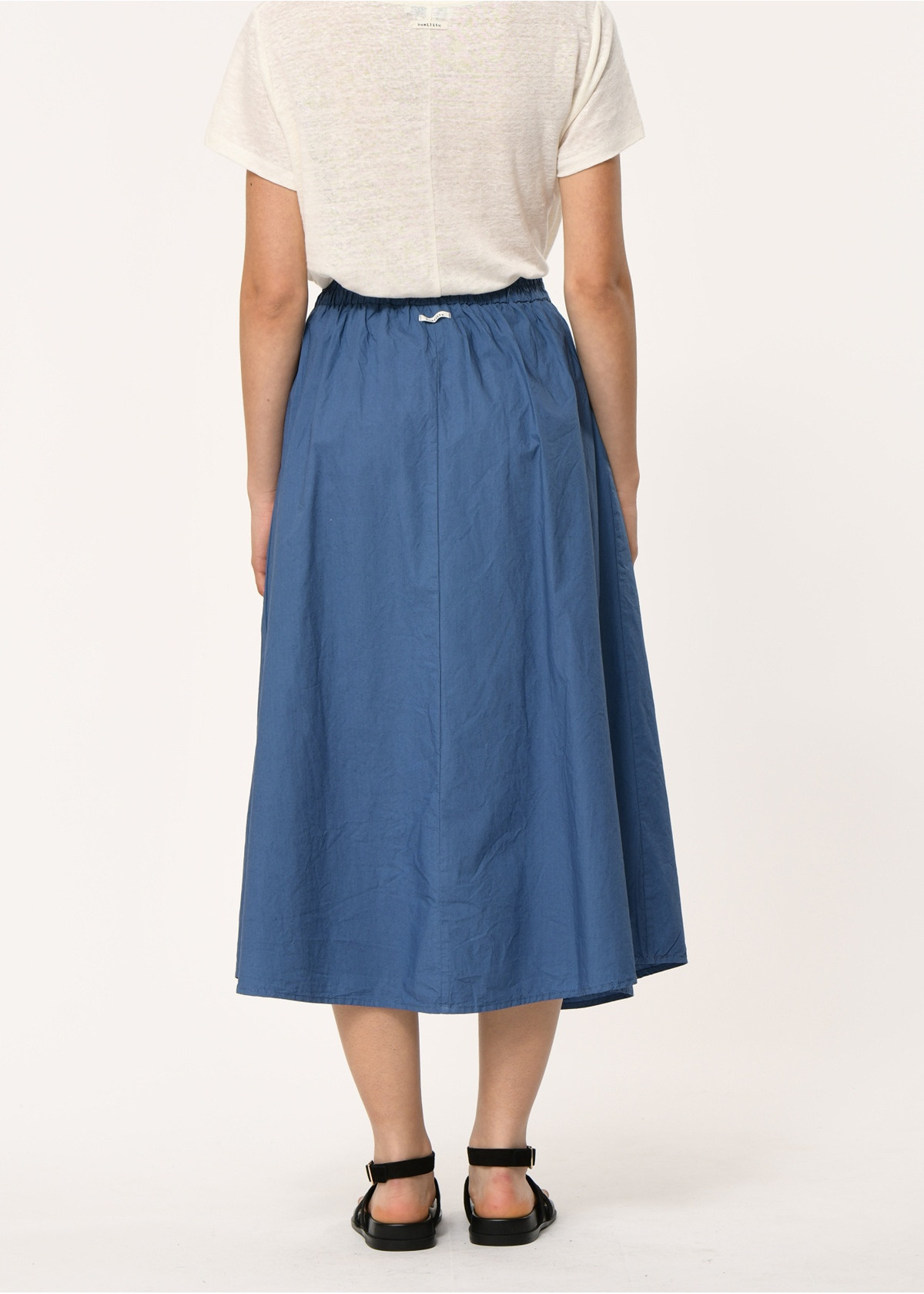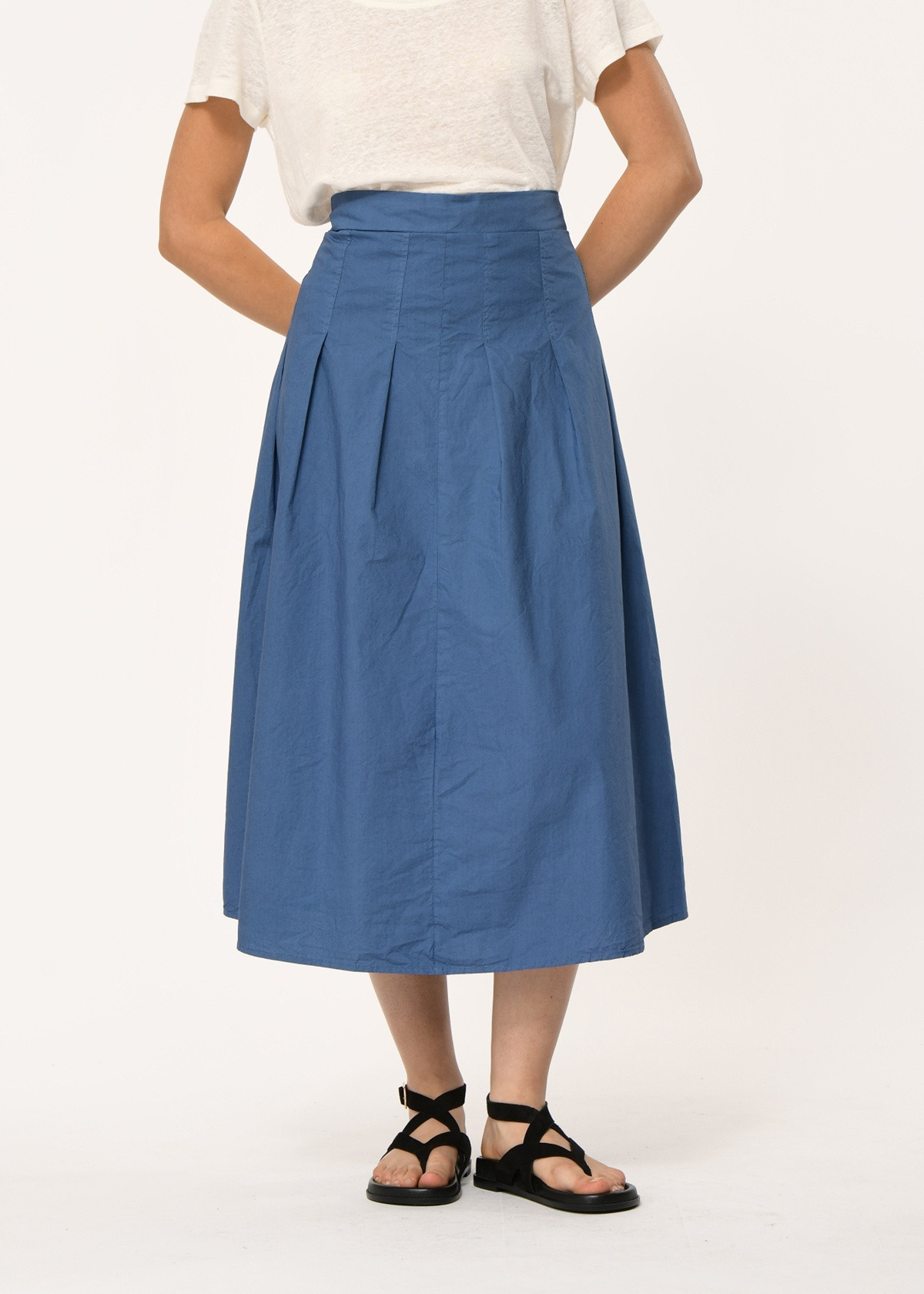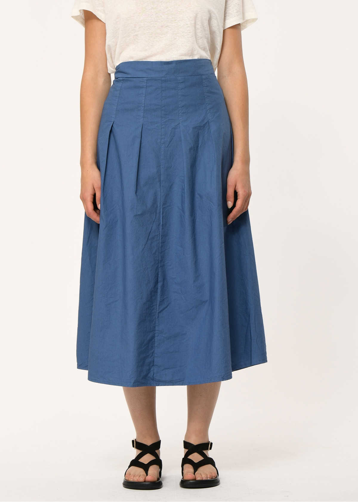 Falda midi evasé de popelina de algodón, entallada en la cintura con pliegues cosidos, cinturón elástico en la espalda