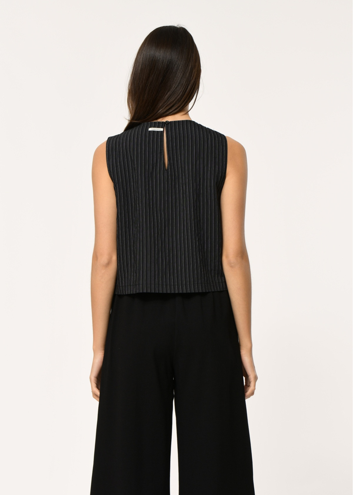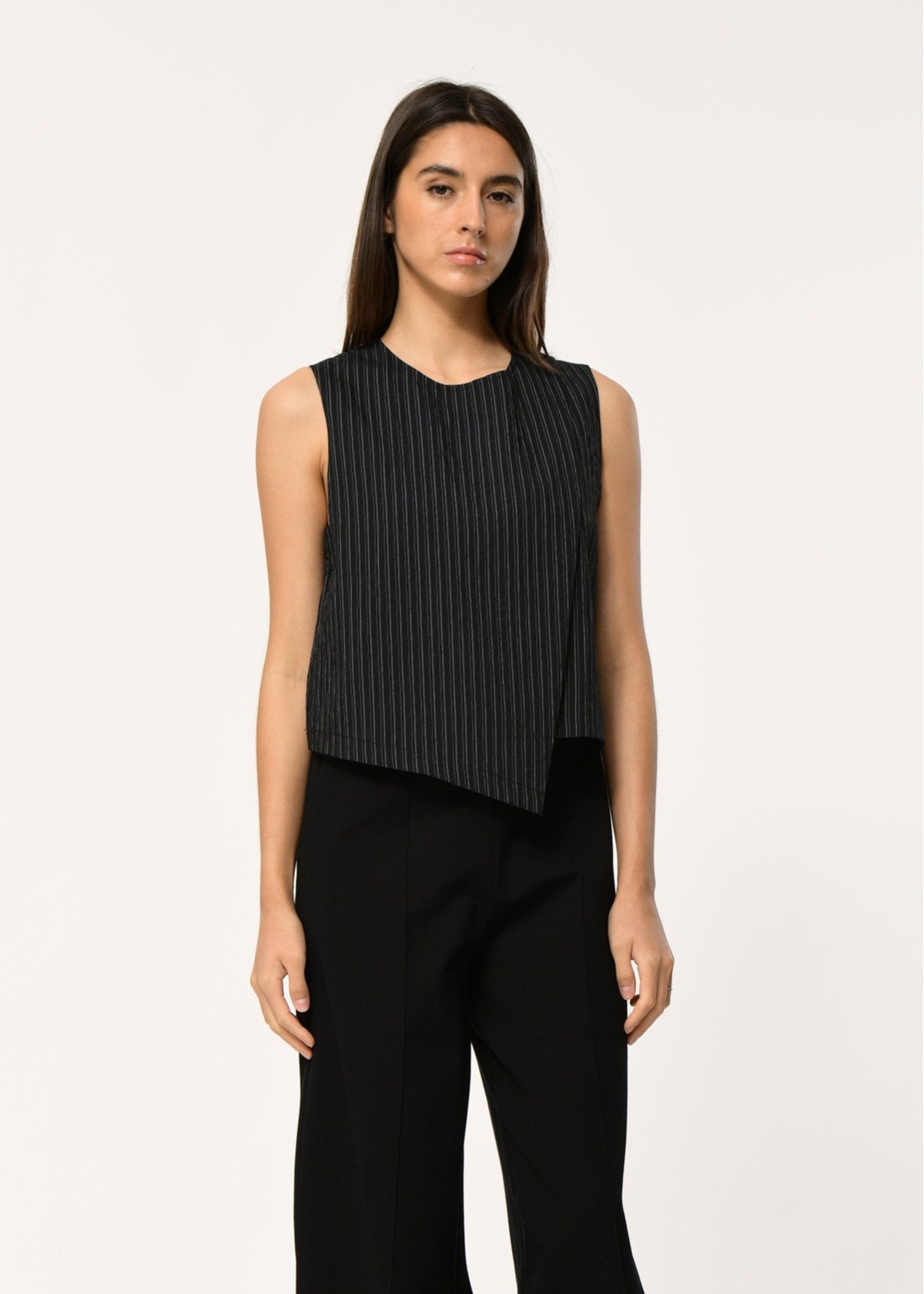 de tirantes asimétrica con rayas finas, corte recto, cuello redondo, abertura en forma de lágrima con botón en la espalda, detalles de paneles doblados asimétricos en la parte delantera