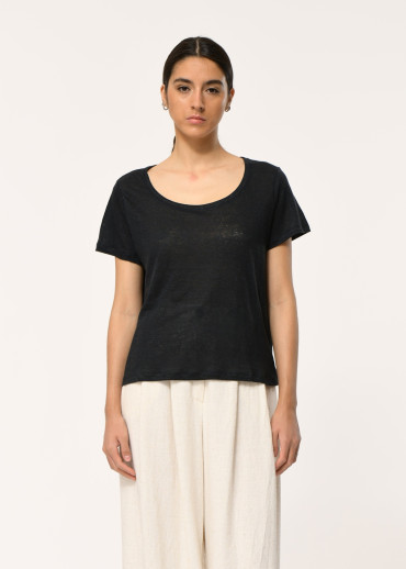 Camiseta holgada de lino flameado, escote bailarina, manga corta, largo a la cadera