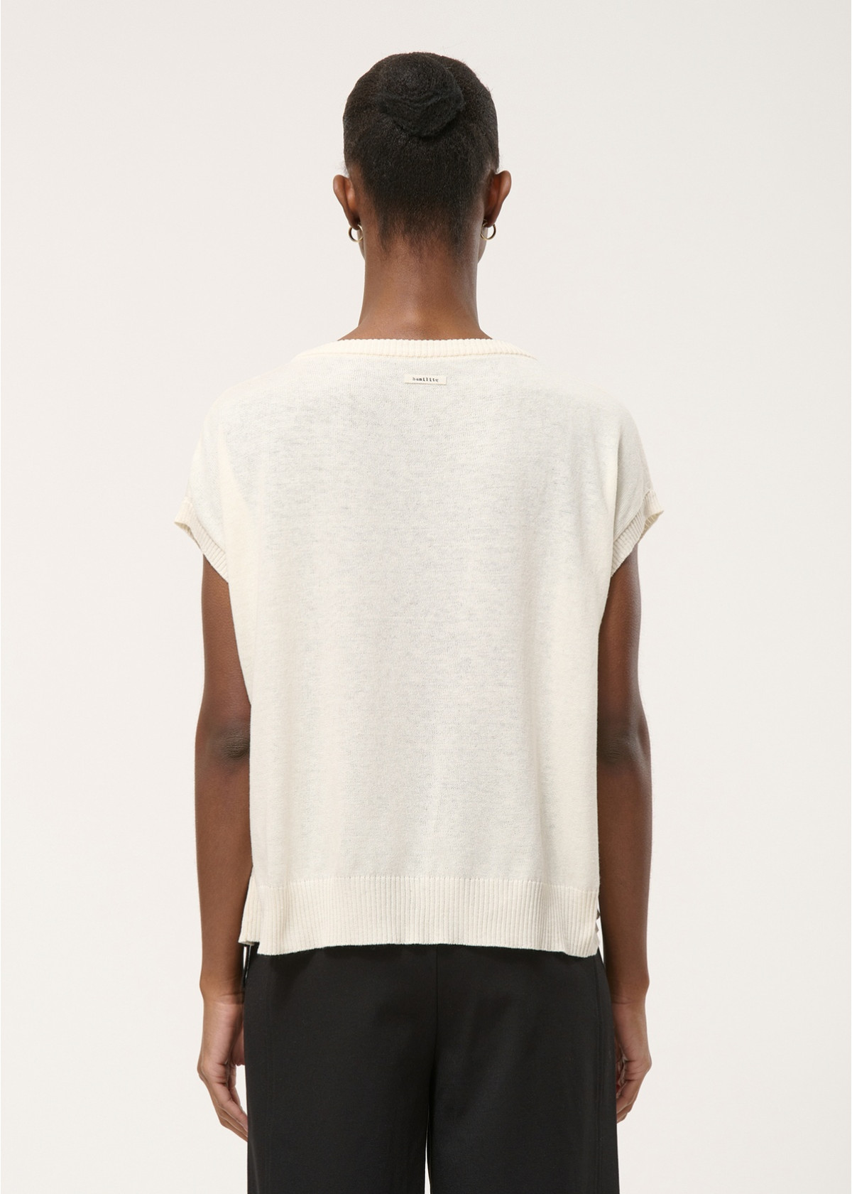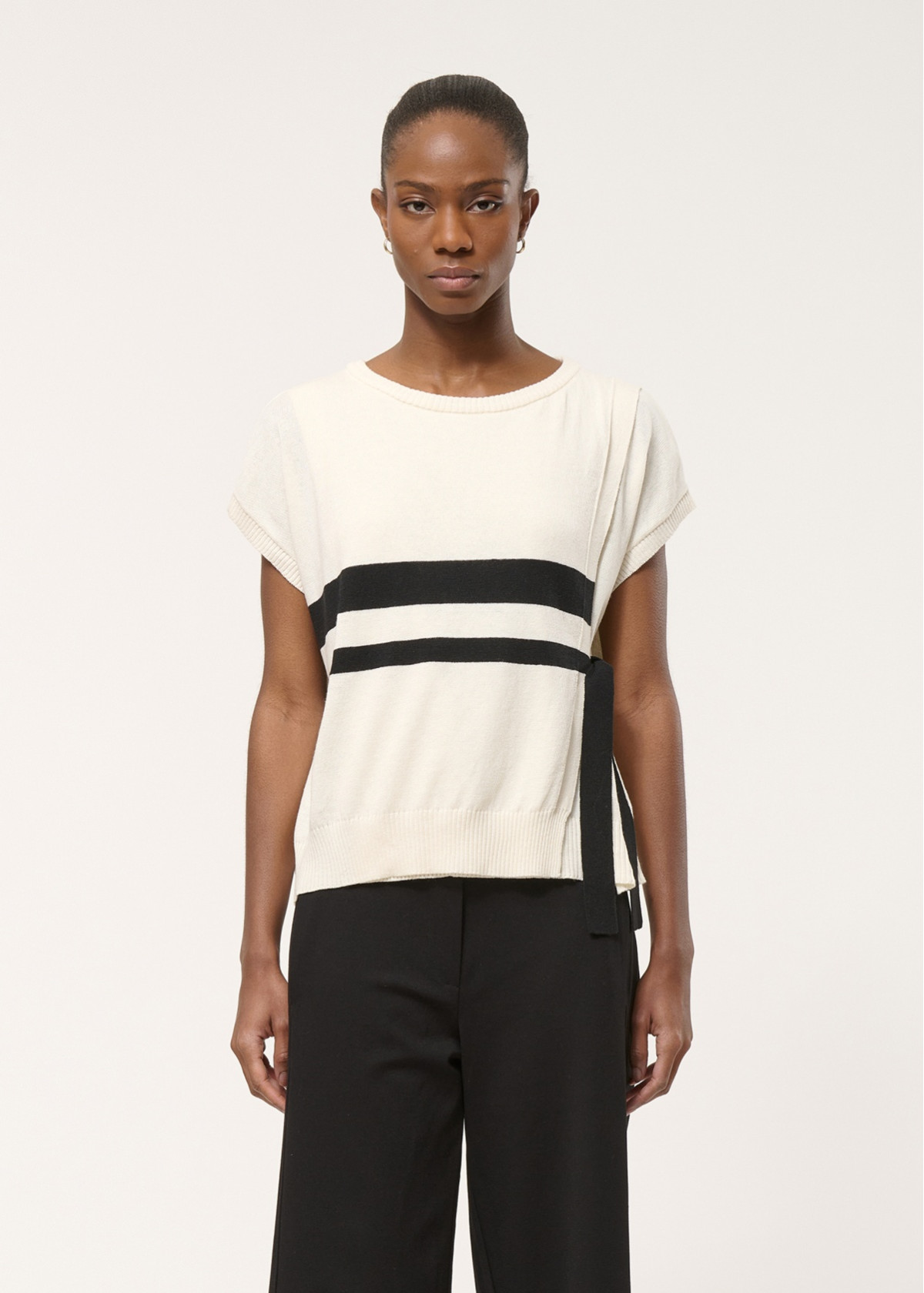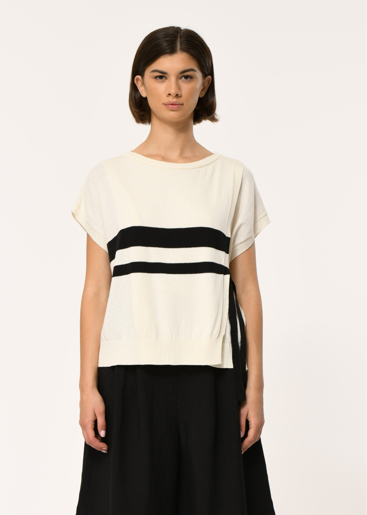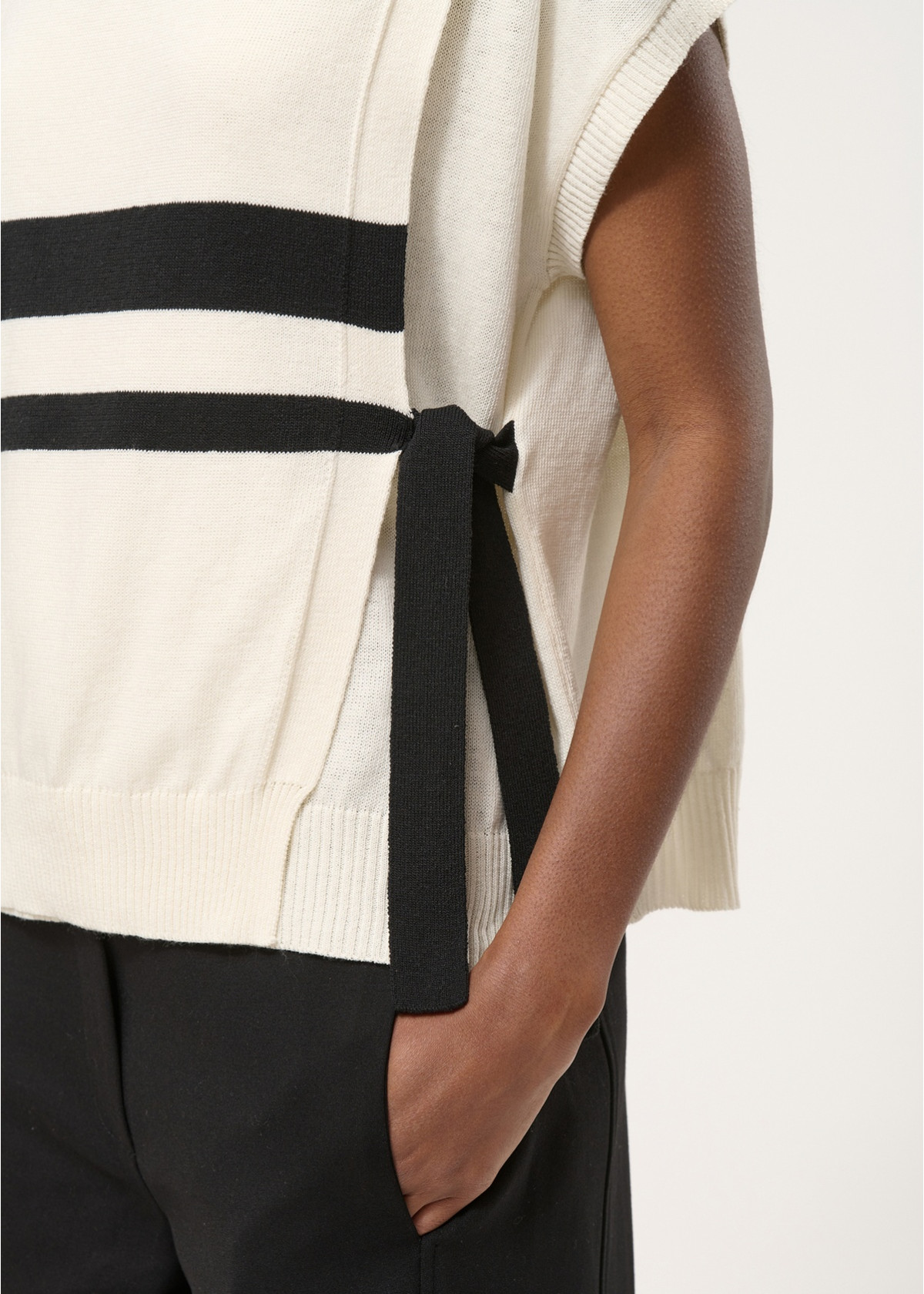 Jersey sin mangas de punto fino de rayas, corte recto y oversize, rayas en contraste, amplio escote redondo con acabados acanalados en sisas, escote y bajo del cuerpo, lazos anudados a los lados para estructurar la silueta.