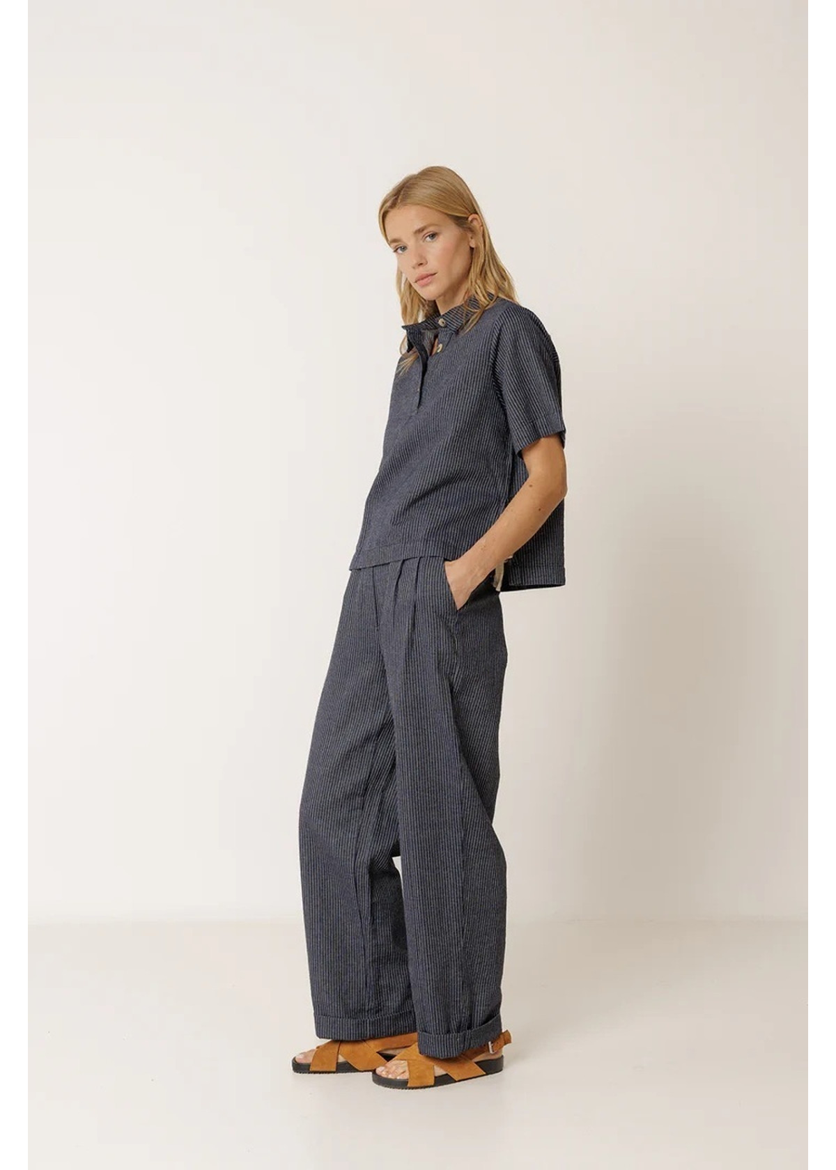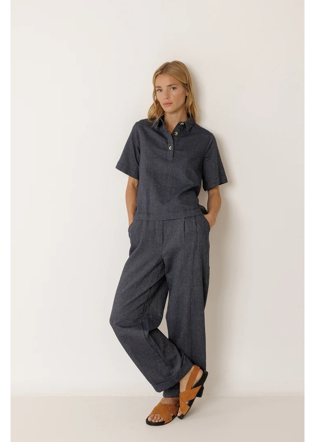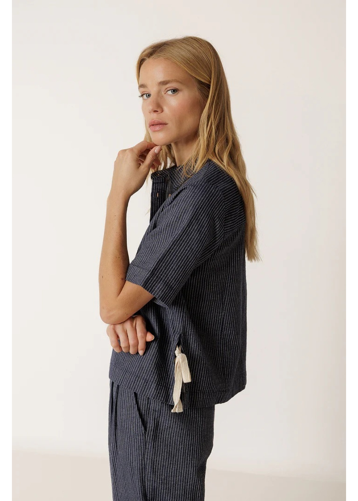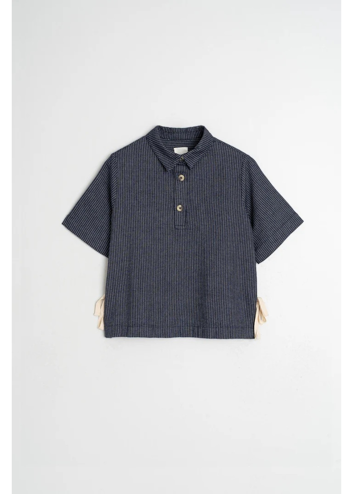 • Cuello polo con cierre de botones. • Manga corta y aberturas laterales con lazada. • Tejido de rayas en algodón orgánico. • Box fit: Diseñado con un corte cuadrado, ancho y corto.