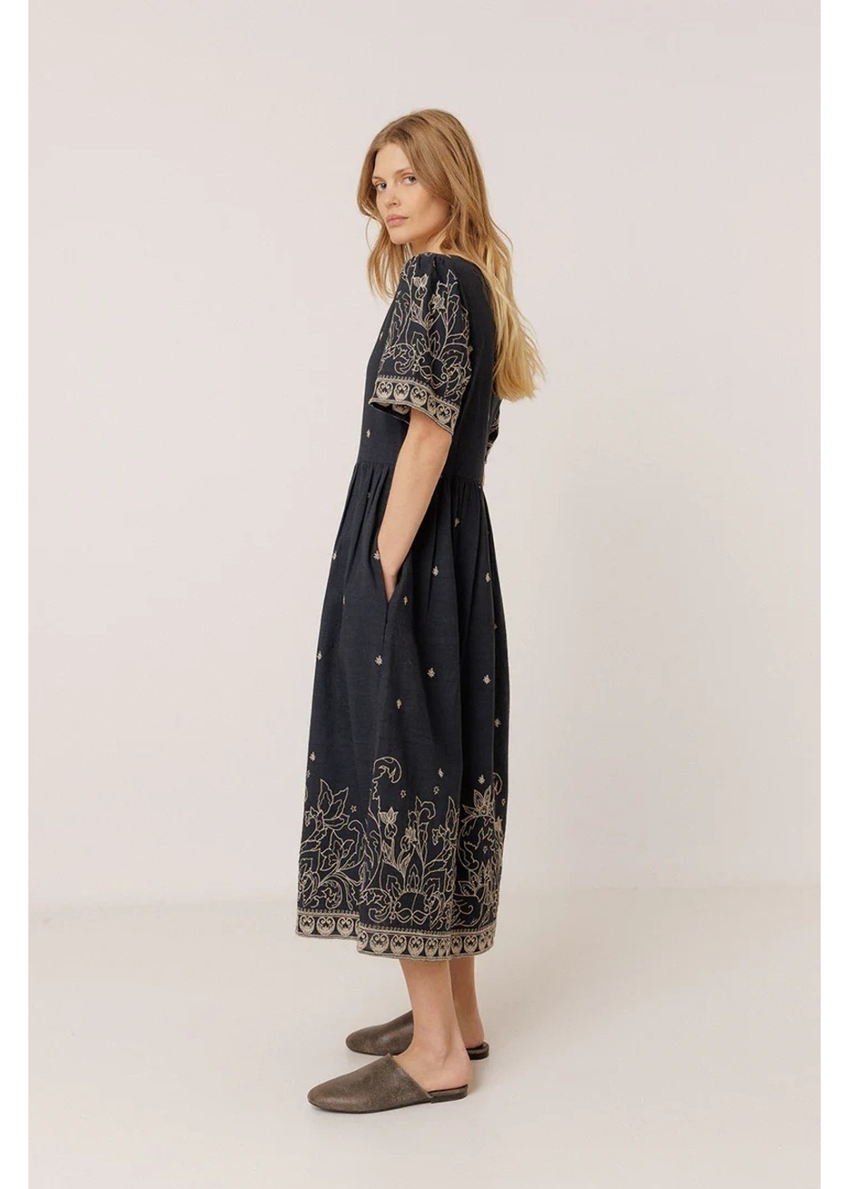 • Hombro encajado y manga corta amplia con bordado floral y cenefa.