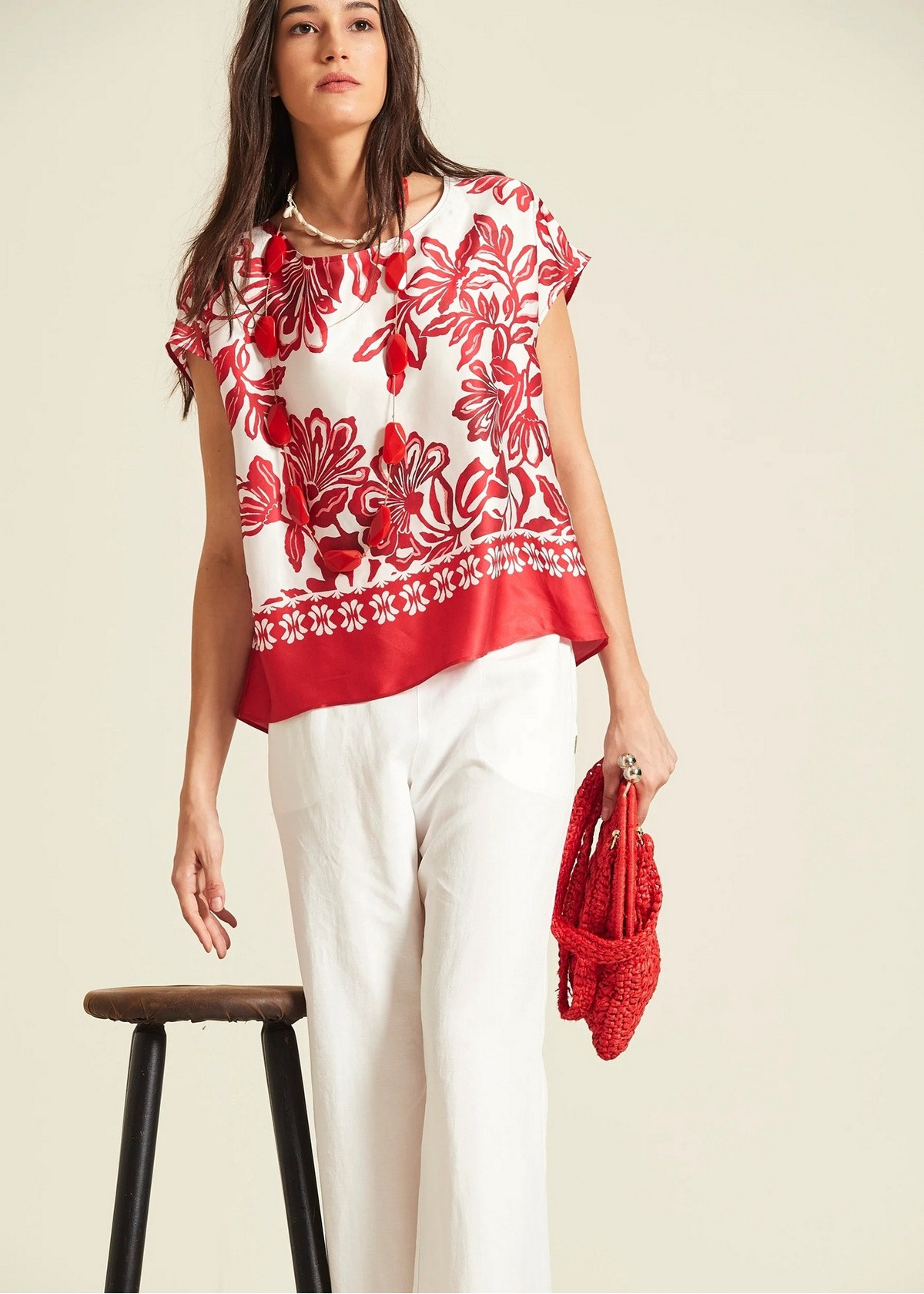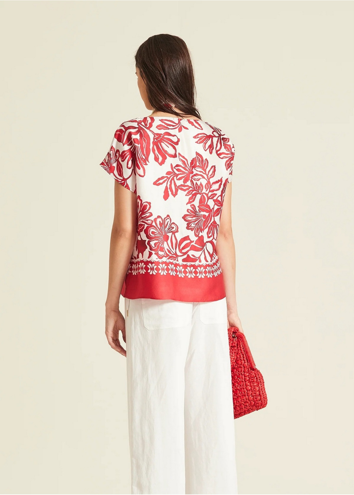 Top de silueta fluida y manga corta japonesa confeccionado en un tejido satinado con estampado floral en rojo y blanco. Presenta un cuello redondo sencillo y destaca por su bajo con greca ornamental en contraste sobre fondo rojo, que aporta estructura al diseño.