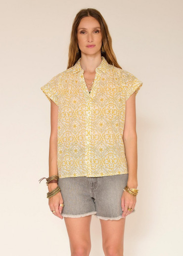 Un estampado soleado en tonos amarillos y crudos aporta un toque de frescura instantánea a cualquier look. El corte es recto y fluido, con mangas cortas ligeramente acampanadas que dejan los hombros al descubierto y crean una silueta estilizada. La caída es natural y fácil de llevar,