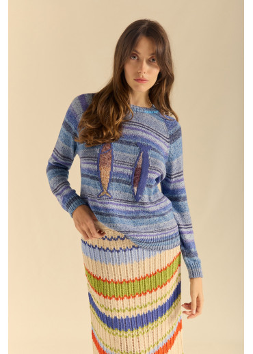 Jersey de punto en manga ranglan. Detalle de jacquard posicionado con sardinas en hilo estampado. Cuello redondo, puños y bajos acanalados.