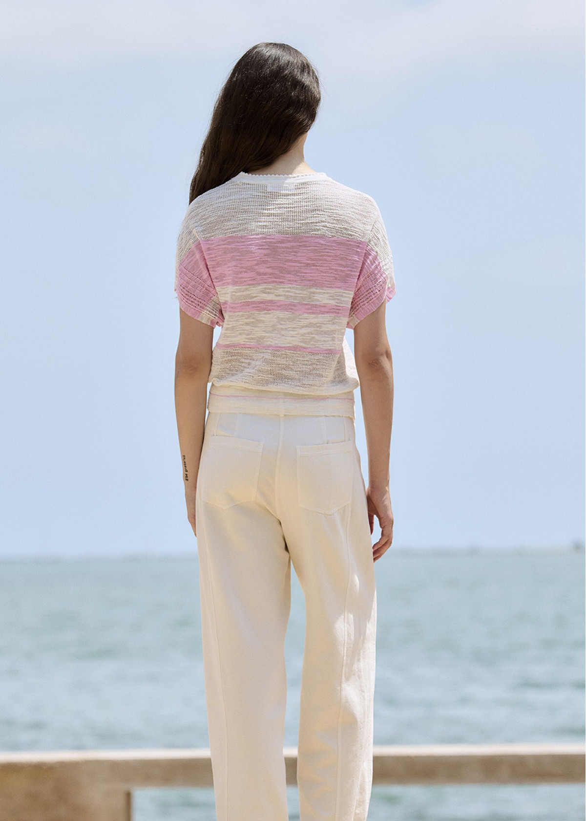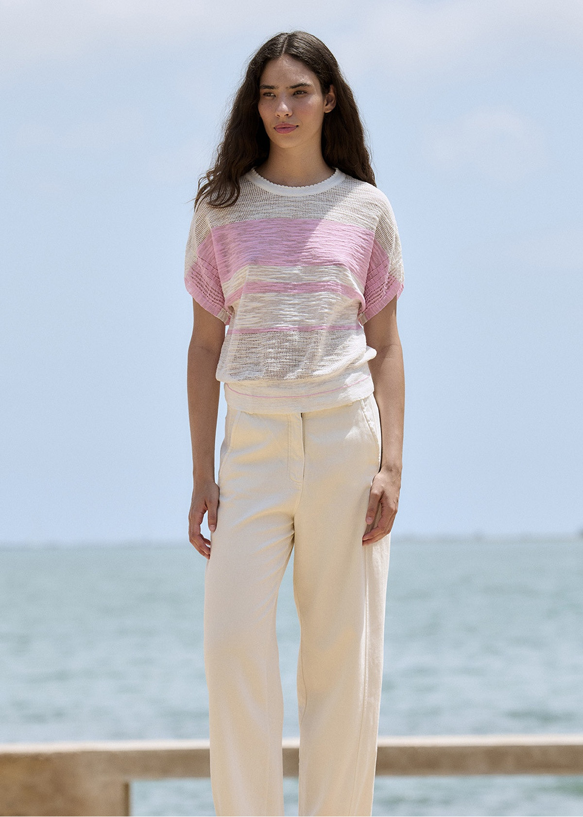 Jersey tejido con hilo flamé combinando punto liso y calado de rejilla. Escote redondo con franja en color de contraste. Bajo ajustado con una línea a contraste. Tejido en Igualada con hilo de Italia.