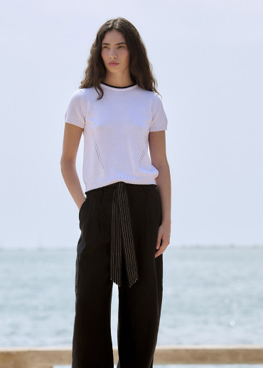 Jersey de cuello redondo con manga corta, totalmente reducido y tejido en galga 8. La espalda tiene dos piezas de canesú tejidas con técnica radial y escote en el centro de la espalda. Línea a contraste en el bajo y en el escote. Tejido en Igualada con hilo de Italia.