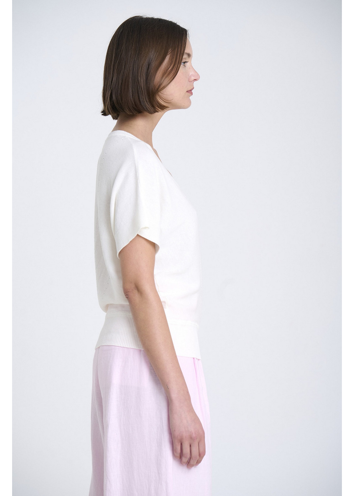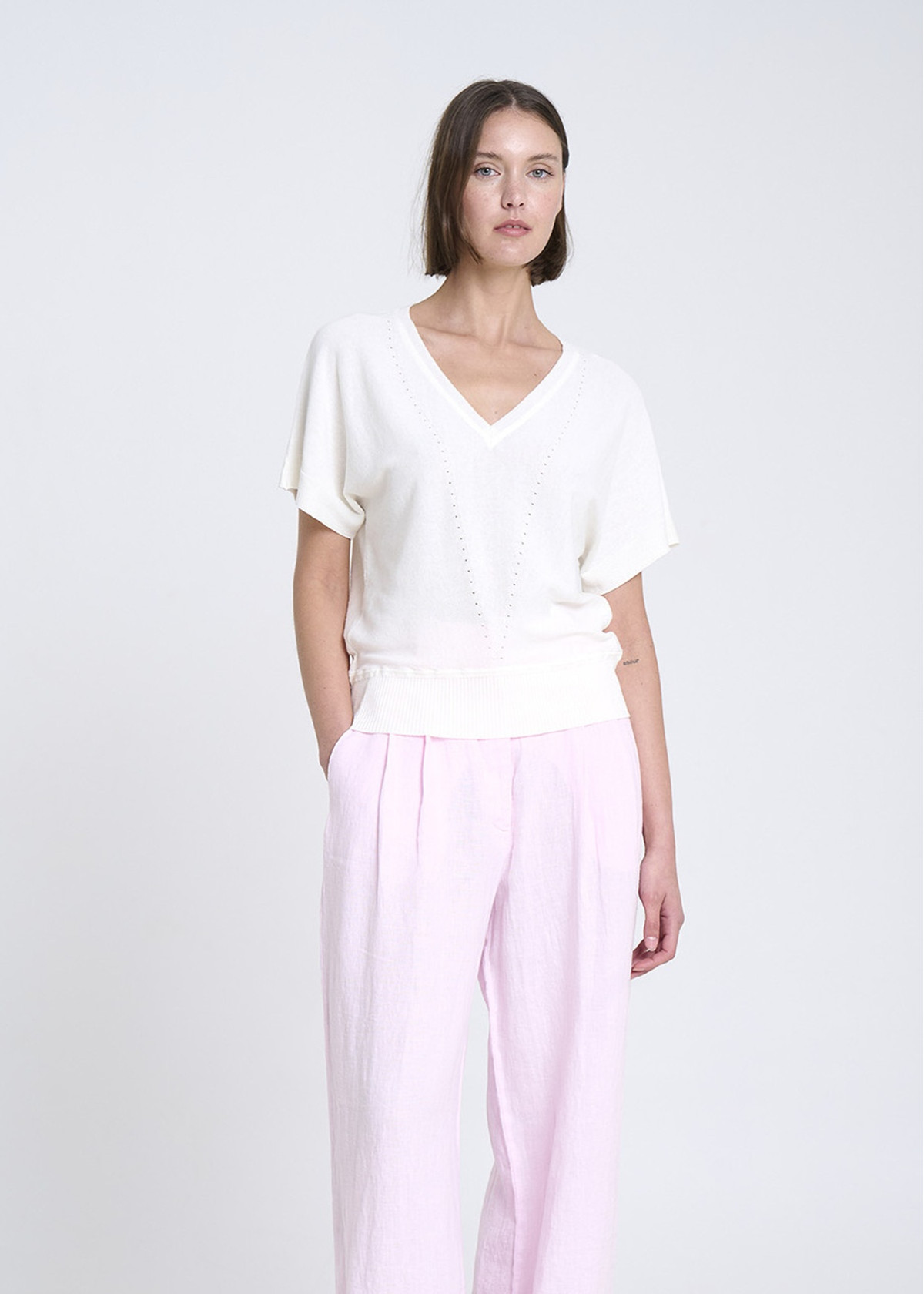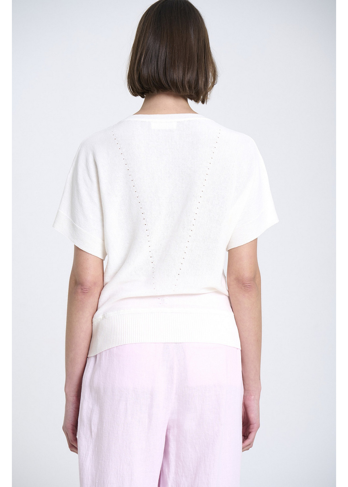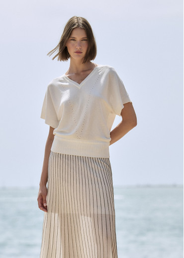 Jersey de punto fino con escote en V, sin costuras, y manga japonesa con detalles reducidos. Bajo ajustado con canalé. Tejido en Igualada con hilo de Italia.