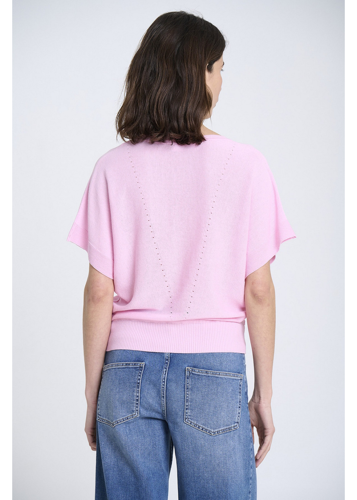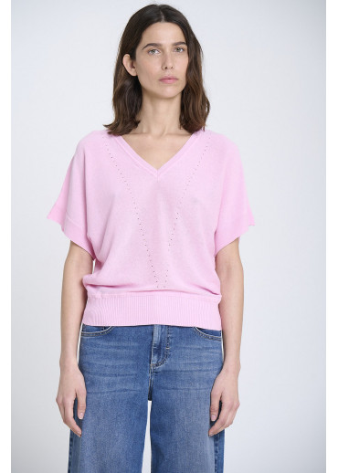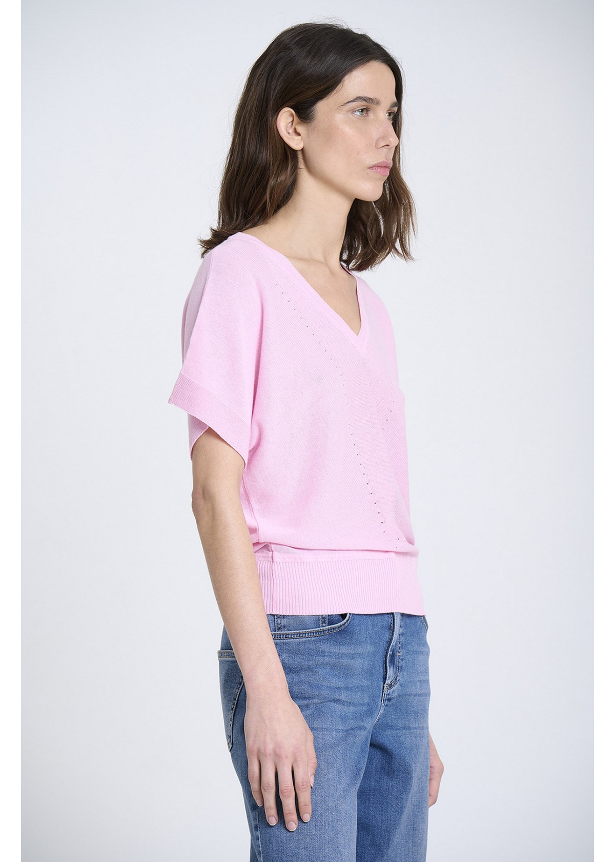 Jersey de punto fino con escote en V, sin costuras, y manga japonesa con detalles reducidos. Bajo ajustado con canalé. Tejido en Igualada con hilo de Italia.