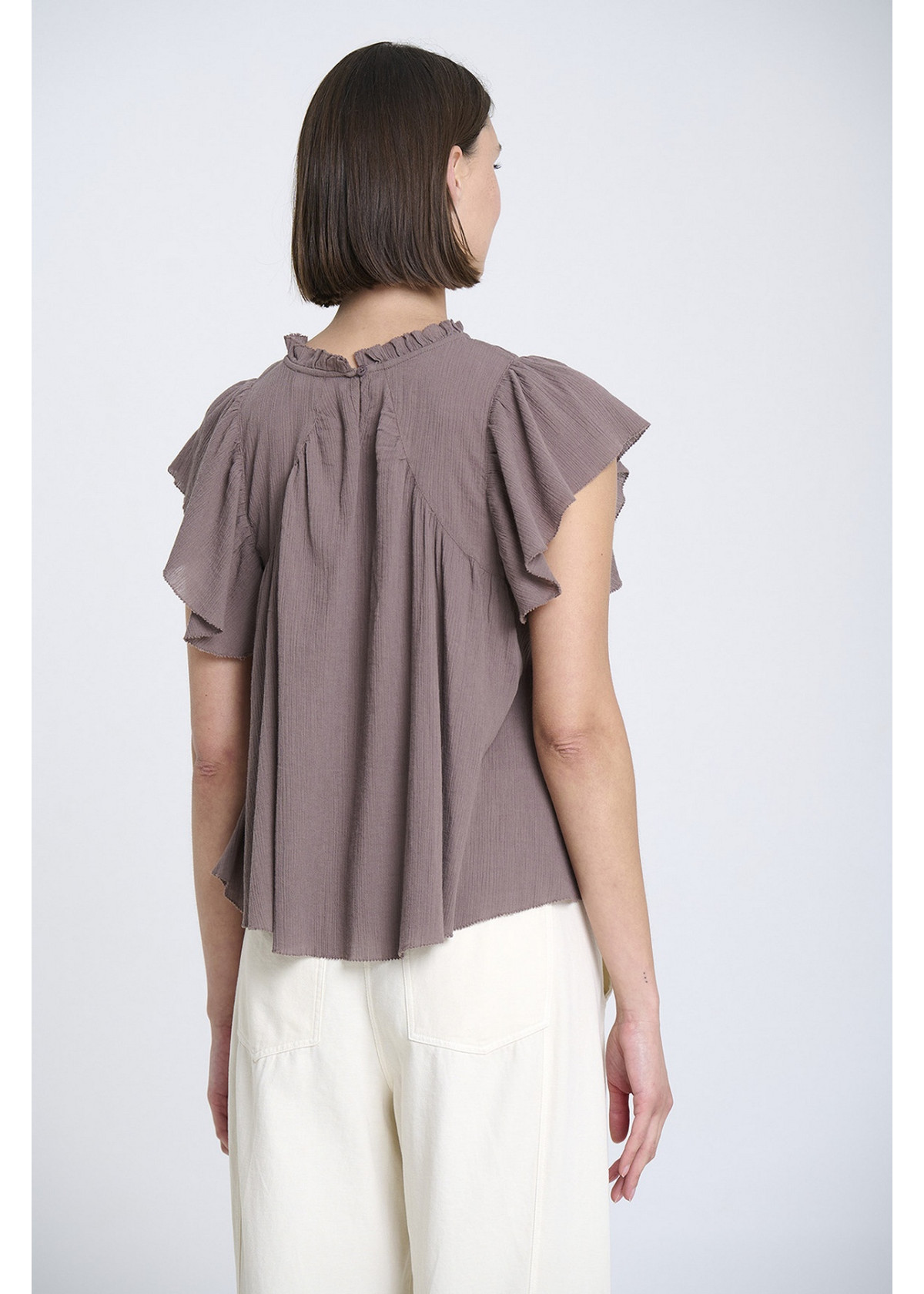 Top de bambula de algodón con escote y mangas ligeramente acampanadas. Cerrado en la espalda con apertura y botón. En el delantero y las sisas tiene un detalle de encaje a tono de algodón.