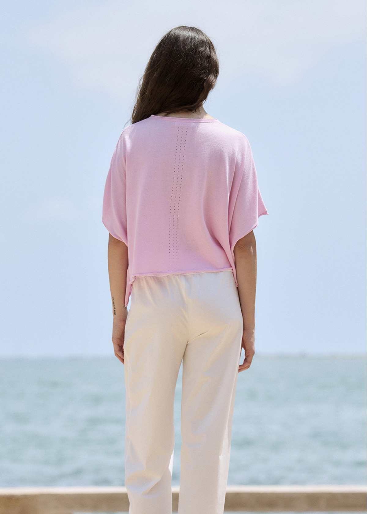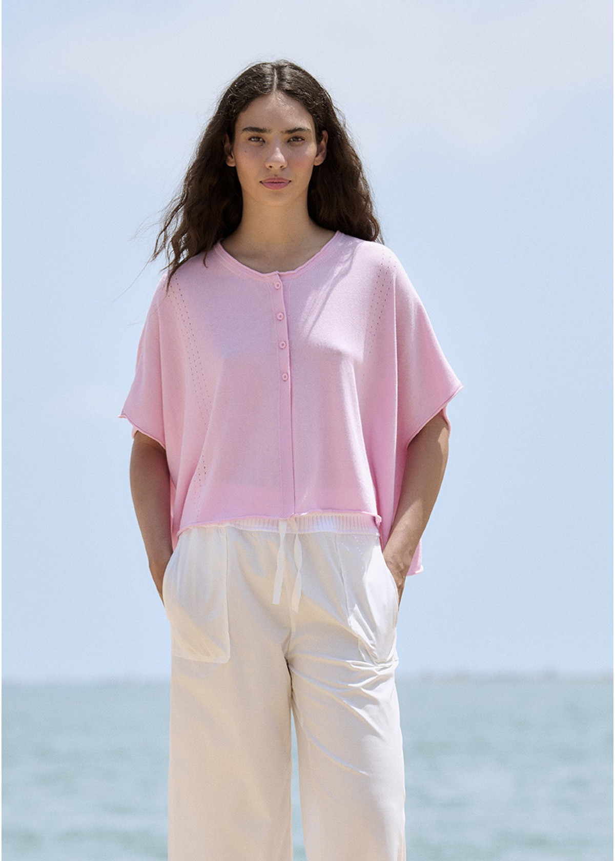 Chaqueta de punto fino oversize con escote redondo y cierre con botones. Tejida en Igualada con hilo de Italia.