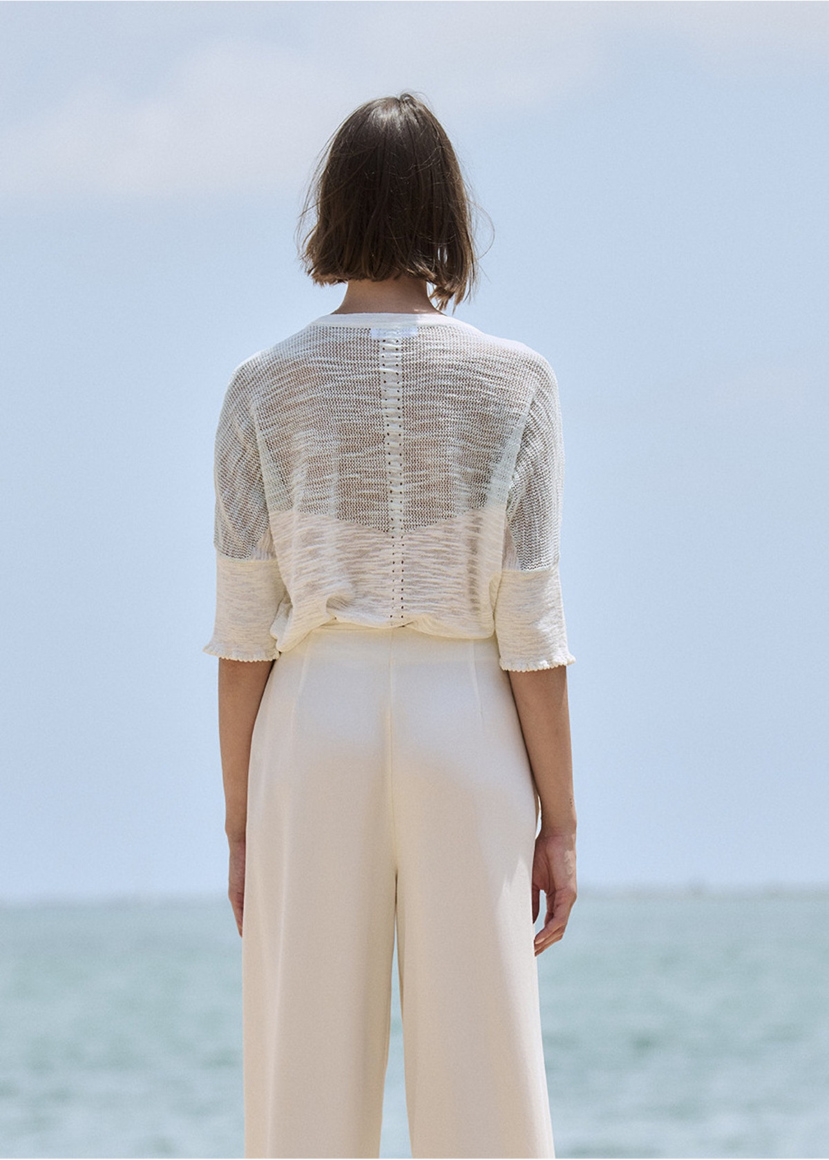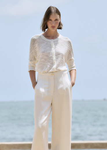 Chaqueta de punto con hilo flamé reducido combinando punto liso y calado de rejilla. Escote redondo con detalle en la tira del cuello. Canesú a contraste y mangas acanaladas. Prenda cerrada con botones. Tejida en Igualada con hilo de Italia.