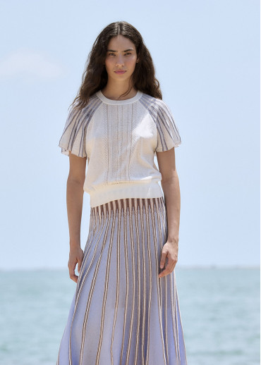 Jersey de punto con pequeños calados en la parte frontal del cuerpo y mangas acampanadas de punto radial a rayas con pequeños calados entre las franjas.